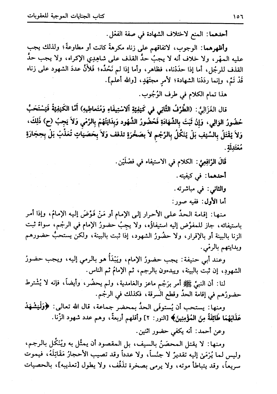 قال الغَزَالِيُّ: (الطَّرَّفُ الثَّانِى في كَيْفِيَّةِ الاسْتِيفَاءِ وَمُتَعاطِيهِ) أَمَّا الكَيْفِيَّةُ فَيُسْتَحَبُّ حُضُورُ الوَالِي، وَإِنْ ثَبَتَ بِالشَّهَادَةِ فَحُضُورُ الشُّهُود وَبِدَايَتُهُم بِالرَّمْيِ وَلاَ يَجِبُ (ح) ذَلِكَ، وَلاَ يُقْتَلُ بِالسَّيْفِ بَل يُنَكَّلُ بِالرَّجْمِ لاَ بصَخْرَةٍ تذفف وَلاَ بِحَصَيَاتٍ تُعَذِّبُ بَلْ بِحِجَارَةٍ مُعْتَدِلَةٍ.
