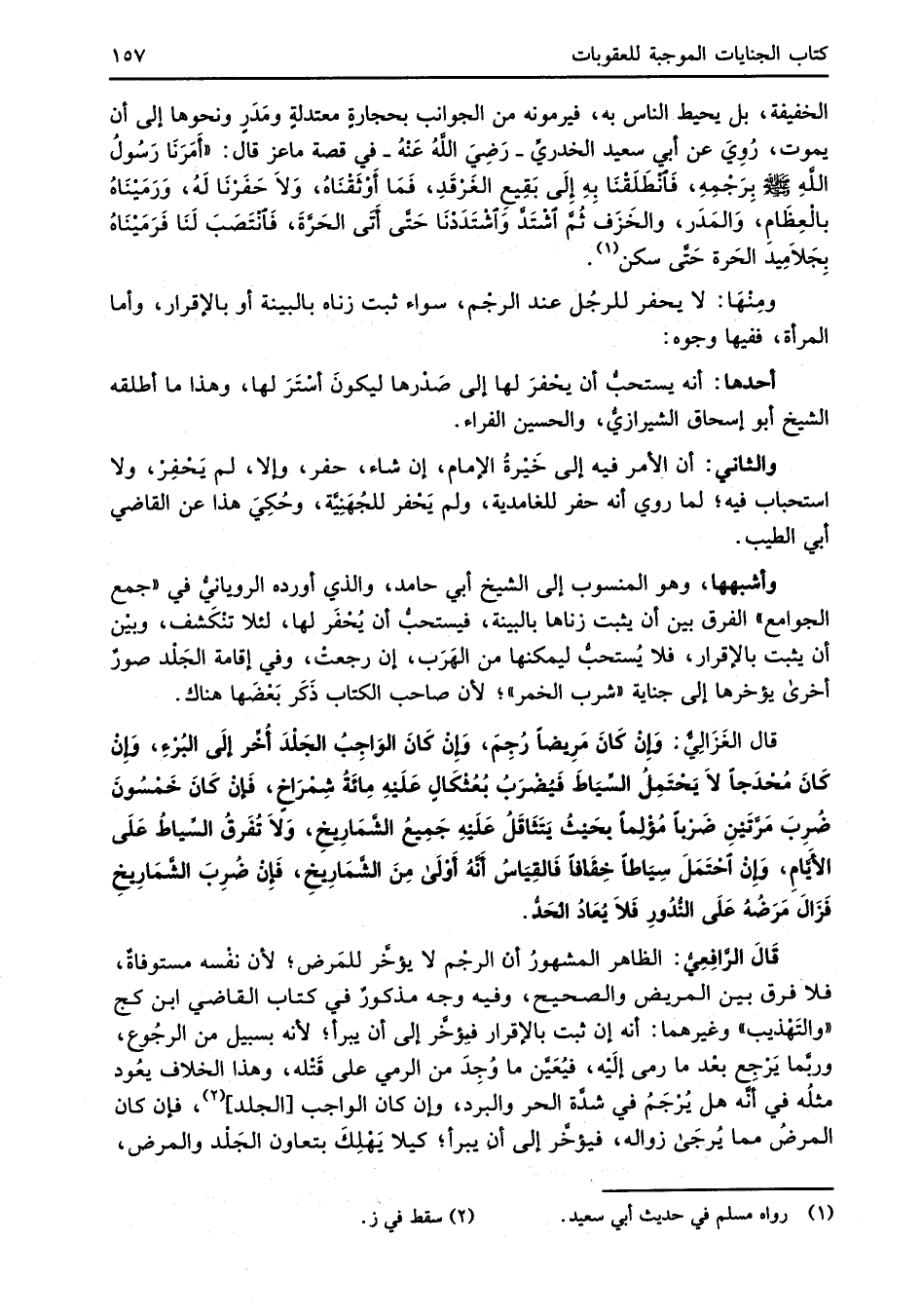 ومِنْهَا: لا يحفر للرجُل عند الرجْم، سواء ثبت زناه بالبينة أو بالإقرار، وأما المرأة، ففيها وجوه: