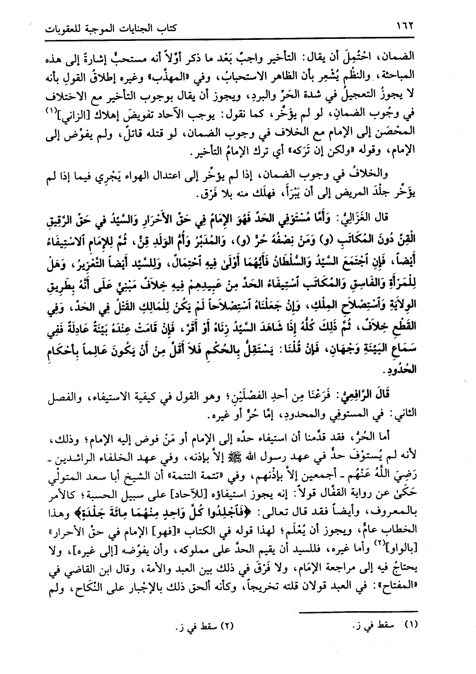 قَالَ الرَّافِعِيُّ: فَرَعْنَا مِن أحدِ الفصْلَيْن؛ وهو القول في كيفية الاستيفاء، والفصل الثاني: في المستوفِي والمحدودِ، إمَّا حُرٌّ أو غيره.