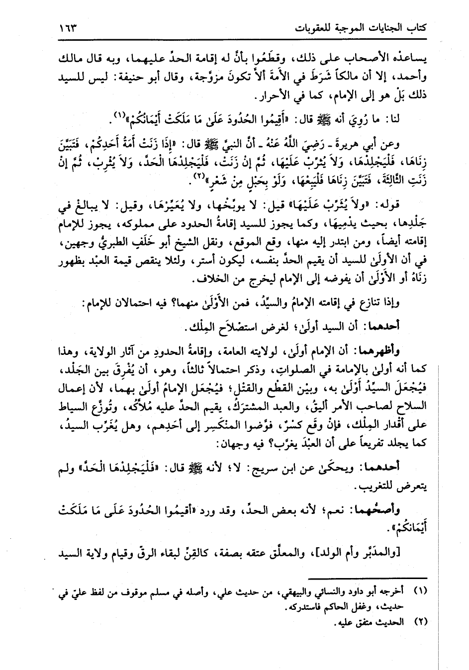 وأظهرهما: أن الإِمام أولَى، لولايته العامة، وإقامةُ الحدودِ من آثار الولاية، وهذا كما أنه أولى بالإمامة في الصلواتٍ، وذكر احتمالاً ثالثاً، وهو، أن يُفْرِقَ بين الجَلْد، فيُجْعَلَ السيِّدُ أَوْلَى به، وبيْن القطْع والقتْل؛ فيُجْعَل الإمامُ أولَى بهما؛ لأن إعمال السلاح لصاحب الأمر أليقُ، والعبد المشترَكُ، يقيم الحدَّ عليه مُلاَّكُه، وتُوزَّع السياط على أقْدار المِلْك، فإنْ وقَع كسْرٌ، فوَّضوا المنْكَسِر إلى أحَدِهم، وهل يُغَرِّب السيدُ، كما يجلد تفريعاً على أن العبْدَ يغرَّب؟ فيه وجهان: