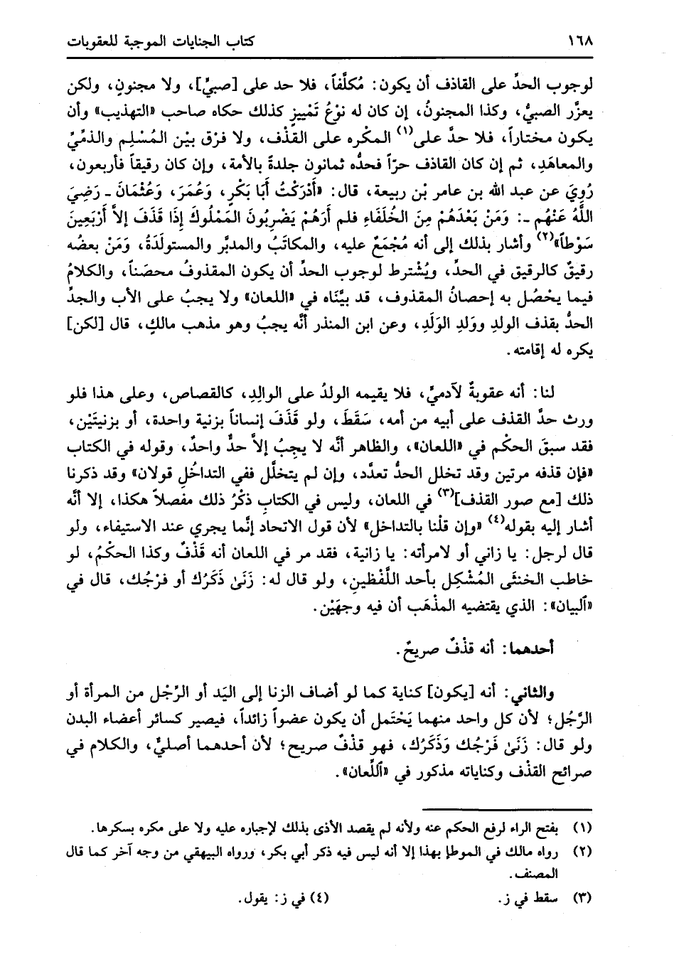 لوجوب الحدِّ على القاذف أن يكون: مُكلَّفاً، فلا حد على [صبيٍّ]، ولا مجنونٍ، ولكن يعزَّر الصبيُّ، وكذا المجنونُ، إن كان له نوْعُ تَمْييزٍ كذلك حكاه صاحب "التهذيب" وأن يكون مختاراً، فلا حدَّ على (¬1) المكْره على القذْف، ولا فرْق بيْن المُسْلِم والذمِّيِّ والمعاهَدِ، ثم إن كان القاذف حرّاً فحدُّه ثمانون جلدةً بالأمة، وإن كان رقيقاً فأربعون، رُويَ عن عبد الله بن عامر بْن ربيعة، قال: "أَدْرَكْتُ أَبا بَكْرٍ، وَعُمَرَ، وَعُثْمَانَ -رَضِيَ اللهُ عَنْهُم-: وَمَنْ بَعْدَهُمْ مِنَ الخُلَفَاءِ فلم أَرَهُمْ يَضْرِبُونَ المَمْلُوكَ إِذَا قَذَفَ إلاَّ أَرْبَعِينَ سَوْطاً" (¬2) وأشار بذلك إلى أنه مُجْمَعٌ عليه، والمكاتَبُ والمدبَّر والمستولَدَةُ، وَمَنْ بعضُه رقيقٌ كالرقيق في الحدِّ، ويُشْترط لوجوب الحدِّ أن يكون المقذوفُ محصَناً، والكلامُ فيما يحْصُل به إحصانُ المقذوف، قد بيَّنَاه في "اللعان" ولا يجبُ على الأب والجدِّ الحدُّ بقذف الولدِ ووَلدِ الوَلَدِ، وعن ابن المنذر أنَّه يجبُ وهو مذهب مالكٍ، قال [لكن] يكره له إقامته.