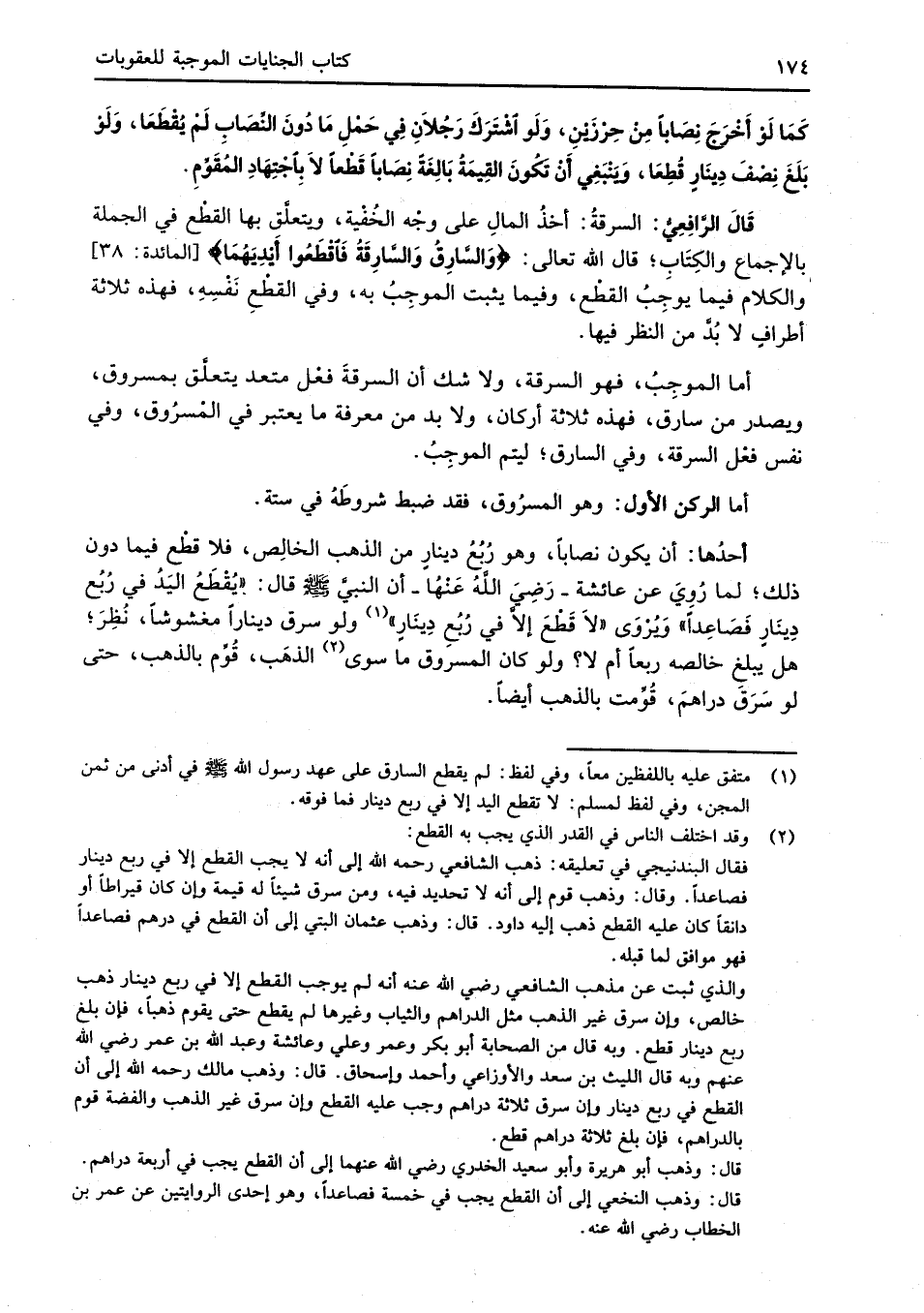 قَالَ الرَّافِعِيُّ: السرقةُ: أخذُ المالِ على وجْه الخُفْية، ويتعلَّق بها القطْع في الجملة بالإجماع والكِتَاب؛ قال الله تعالى: {وَالسَّارِقُ وَالسَّارِقَةُ فَاقْطَعُوا أَيْدِيَهُمَا} [المائدة: 38] والكلام فيما يوجِبُ القطْع، وفيما يثبت الموجِبُ به، وفي القطْعِ نَفْسِهِ، فهذه ثلاثة أطرافٍ لا بُدَّ من النظر فيها.