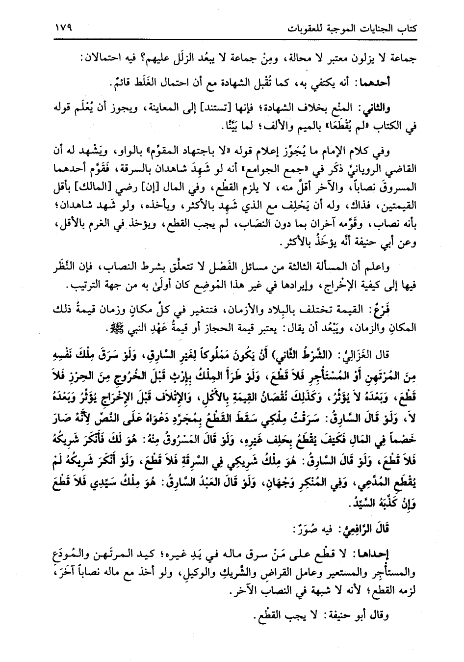 قال الغَزَالِيُّ: (الشَّرْطُ الثَّاني) أَنْ يَكُونَ مَمْلُوكاً لِغَيْرِ السَّارِقِ، وَلَوْ سَرَقَ مِلْكَ نَفْسِهِ مِنَ المُرْتَهِنِ أَوْ المُسْتَأْجِرِ فَلاَ قَطْعَ، وَلَوْ طَرَأَ المِلْكُ بِإرْثِ قَبْلَ الخُرُوجِ مِنَ الحِرْزِ فَلاَ قَطْعَ، وَبَعْدَهُ لاَ يُؤَثرُ، وَكَذَلِكَ نُقْصَانُ القِيمَةِ بِالأَكْلِ، وَالإتْلاَف قَبْلَ الإِخْرَاجِ يُؤَثِّرُ وَبَعْدَهُ لاَ، وَلَوْ قَالَ السَّارِقُ: سَرَقْت مِلْكِي سَقَطَ القَطعُ بِمُجَرَّدِ دَعْوَاهُ عَلَى النَّصِّ لأنَّهُ صَارَ خَصْماً فِي المَالِ فَكَيْفَ يُقْطَعُ بِحَلِف غَيْرِهِ، وَلَوْ قَالَ المَسْرُوقُ مِنْهُ: هُوَ لَكَ فَأَنْكَرَ شَرِيكُهُ فَلاَ قَطْعَ، وَلَوْ قَالَ السَّارِقُ: هُوَ مِلْكُ شَرِيكِي في السَّرِقَةِ فَلاَ قَطْعَ، وَلَوْ أَنْكَرَ شَرِيكُهُ لَمْ يُقْطَعِ المُدَّعِي، وَفِي المُنْكِرِ وَجْهَانِ، وَلَوْ قَالَ العَبْدُ السَّارِقُ: هُوَ مِلْكُ سَيِّدِي فَلاَ قَطْعَ وَإِنْ كَذَّبَهُ السَّيِّدُ.