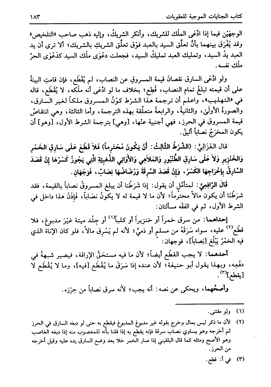 قال الغَزَالِيُّ: (الشَّرْطُ الثَّالِثُ: أَنْ يَكُونَ مُحْتَرِماً) فَلاَ قَطْعَ عَلَى سَارِقِ الخَمْرِ وَالخَنْزِيرِ وَلاَ عَلَى سَارِقِ الطُّنْبُورِ وَالمَلاَهِي وَالأَوَانِي الذَّهَبِيَّةِ الَّتِي يَجُوزُ كَسْرُهَا إِنْ قَصَدَ السَّارِقُ بِإخْرَاجِهَا الكَسْرُ، وَإِنَ قَصَدَ السَّرِقَةَ وَرُضَاضُهَا نِصَابٌ، فَوَجْهَانِ.