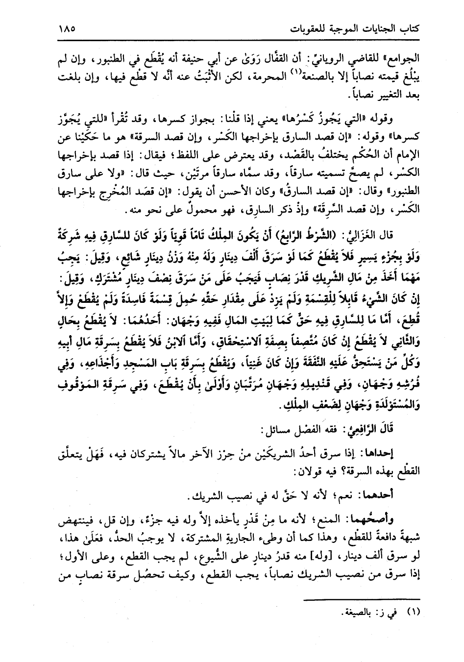قال الغَزَالِيُّ: (الشَّرْط الرَّابعُ) أَنْ يَكُونَ المِلْكُ تَامّاً قَوِيّاً وَلَوْ كَانَ للسَّارِقِ فِيهِ شَرِكَةٌ وَلَوْ بِجُزْءٍ يَسِيرِ فَلاَ يُقْطَعُ كَمَا لَوْ سَرَقَ أَلْفَ دِينَارٍ وَلَهُ مِنْهُ وَزْنُ دِينَارٍ شَائِعٍ، وَقِيلَ: يَجِبُ مَهْمَا أَخَذَ مِنْ مَالِ الشَّرِيكِ قَدْرَ نِصَابٍ فَيَجَبُ عَلَى مَنْ سَرَقَ نِصْفَ دِينَارٍ مُشْتَرَكٍ، وَقِيلَ: إِنْ كَانَ الشَّىْءُ قَابِلاً لِلْقِسْمَةِ وَلَمْ يَزِدْ عَلَى مِقْدَارِ حَقِّهِ حُمِلَ قِسْمَةً فَاسِدَةً وَلَمْ يُقْطَعْ وَإِلاَّ قُطِعَ، أَمَّا مَا لِلسَّارِقِ فِيهِ حَقٌّ كَمَا لِبَيْتِ المَالِ فَفِيهِ وَجْهَان: أَحَدُهُمَا: لاَ يُقْطَعُ بِحَالٍ وَالثَّانِي لاَ يُقْطَعُ إِنْ كانَ مُتَّصِفاً بِصِفَةِ الاسْتِحْقَاقِ، وَأَمَّا الابْنُ فَلاَ يُقْطَعُ بِسَرِقَةِ مَالِ أبِيهِ وَكُلِّ مَنْ يَسْتَحِقُّ عَلَيْهِ النَّفَقَةَ وَإِنْ كَانَ غَنِيّاً، وَيُقْطَعُ بِسَرِقَةِ بَابِ المَسْجِدِ وَأَجْذَاعِهِ، وَفِي فُرُشِهِ وَجْهَانِ، وَفِي قَنْدِيلِهِ وَجْهَانِ مُرَتَّبَانِ وَأَوْلَى بِأَنْ يُقْطَعَ، وَفِي سَرِقَةِ المَوْقُوفِ وَالمُسْتَوْلَدَةِ وَجْهَانِ لِضَعْفِ المِلْكِ.