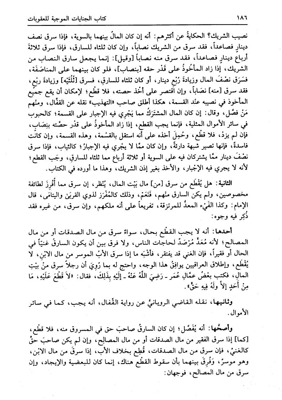 نصيب الشريك؟ الحكايةُ عن أكثرهم: أنه إن كان المالُ بينهما بالسوية، فإذا سرق نصف دينارٍ فصاعداً، فقد سرق من الشريك نصاباً، هان كان ثلثاه للسارق، فإذا سرق ثلاثةَ أرباع دينارٍ فصاعداً، فقد سرق منه نصاباً [وقيل]: إنما يجعل سارق النصاب من الشريك، إذا زاد المأخُوذُ على قَدْر حقه [بنصاب]، فلو كان بينهما على المناصَفَة، فسَرَق نصْفَ المال وزيادةَ رُبْعِ دينار، أو كان ثلثاه للسارقِ، فسرق [ثُلُثَيْه] وزيادةَ ربْعٍ، فقد سرق [منه] نصَاباً، وإن اقتصر على أخْذ حصته، فلا قطْع؛ لإمكان أن يقع جميع المأخوذ في نصيبه عنْد القسمة، هكذا أطلق صاحب "التهذيب" نقله عن القفَّال، ومنْهم مَنْ فصَّل، وقال: إن كان المال المشتَرَكُ مما يَجْرِي فيه الإجبار على القسمة؛ كالحبوب في سائر الأموال المثلية، فإنما يجب القطع، إذا زاد المأخوذُ على قدْر حصَّته بنِصَابٍ، فإن لم يزدْ، فلا قطْع، وحُمِلَ أخذه على أنه استقل بالقسْمة، وهذه القسمة، وإن كانت فاسدةٌ، فإنها تصير شبهة دارئةً، وإن كان ممَّا لا يجْري فيه الإجبارُ؛ كالثياب، فإذا سرق نصْفَ دينار ممَّا يشتركان فيه على السوية أو ثلاثة أرباع مما ثلثاه للسارقِ، وجَب القطع؛ لأنه لا يجري فيه الإجْبار، والأخذ بغير إذن الشريك، وهذا ما أورده في الكتاب.