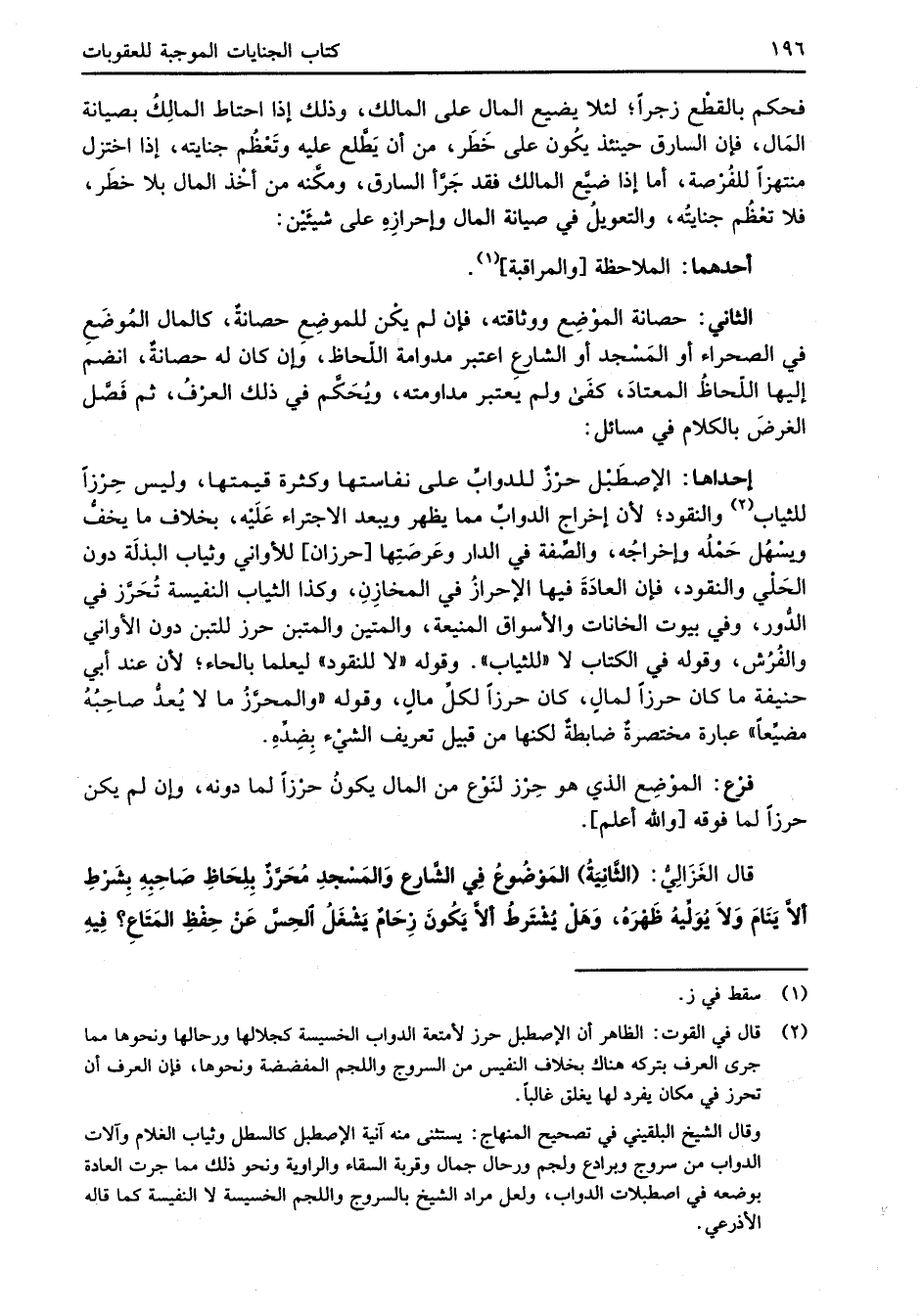 (¬2) قال في القوت: الظاهر أن الإصطبل حرز لأمتعة الدواب الخسيسة كجلالها ورحالها ونحوها مما جرى العرف بتركه هناك بخلاف النفيس من السروج واللجم المفضضة ونحوها، فإن العرف أن تحرز في مكان يفرد لها يغلق غالباً.