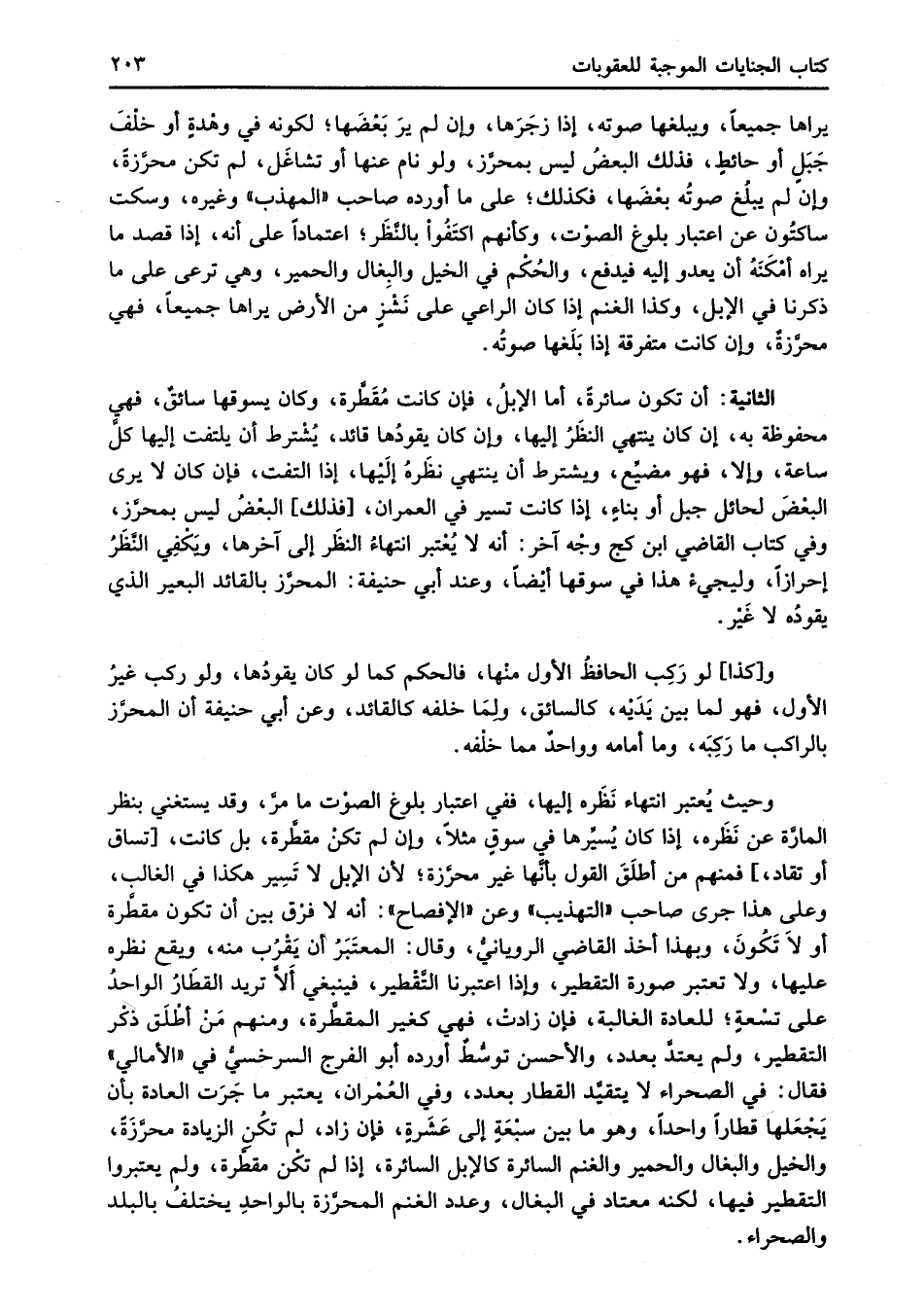 وحيث يُعتبر انتهاء نَظَره إليها، ففي اعتبار بلوغ الصوْت ما من، وقد يستغني بنظر المارَّة عن نَظَره، إذا كان يُسيِّرها في سوقٍ مثلاً، وإن لم تكنْ مقطَّرة، بل كانت، [تساق أو تقاد،] فمنهم من أطلَقَ القول بأنَّها غير محرَّزة؛ لأن الإبل لا تَسِير هكذا في الغالب، وعلى هذا جرى صاحب "التهذيب" وعن "الإفصاح": أنه لا فرْق بين أن تكون مقطَّرة أو لاَ تَكُونَ، وبهذا أخذ القاضي الرويانيُّ، وقال: المعتَبَرُ أن يَقْرُب منه، ويقع نظره عليها، ولا تعتبر صورة التقطير، وإذا اعتبرنا التَّقْطير، فينبغي ألاَّ تريد القطَارُ الواحدُ على تسْعةٍ؛ للعادة الغالبة، فإن زادتْ، فهي كغير المقطَّرة، ومنهم مَن أطْلَق ذكْر التقطير، ولم يعتدَّ بعدد، والأحسن توسُّطٌ أورده أبو الفرج السرخسيُّ في "الأمالي" فقال: في الصحراء لا يتقيَّد القطار بعدد، وفي العُمْران، يعتبر ما جَرَت العادة بأن يَجْعَلها قطاراً واحداً، وهو ما بين سبْعَةٍ إلى عَشَرةٍ، فإن زاد، لم تكُن الزيادة محرَّزَةً، والخيل والبغال والحمير والغنم السائرة كالإبل السائرة، إذا لم تكْن مقطرة، ولم يعتبروا التقطير فيها، لكنه معتاد في البغال، وعدد الغنم المحرَّزة بالواحدِ يختلفُ بالبلد والصحراء.