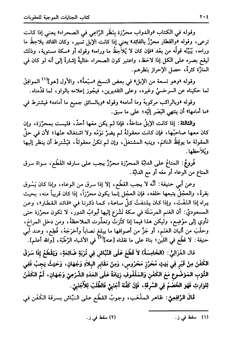 وعن أبي حنيفة: أنَّه لا يجب القطع، إلا إذا سرق من الوعاء، وإذا كان يَسُوق بقرةً، والعجْلُ يتبعها خلفه، فإن العجْل إنما يكون محرَّزاً، إذا كان قريباً منه، بحيث يراه إذا التَفَتَ، وإذا كان يلتفتُ كلَّ ساعة، كما ذكرنا في "قائد القطار"، وعن المسعوديِّ: أن الغنم المرسَلَة في سكة تَشْرَع إليها أبوابُ الدور، لا تكون محرَّزة حتى تأوي إلى موْضِع، وليكن هذا فيما إذا كثُرَتْ وتعذَّرت الملاحظةُ، ومن دخل المراحَ، وحلَبَ من ألبان الغنَمِ، أو جَزَّ من أصوافها ما يبلني نصاباً وأخرَجَهُ، قُطِع، وعند أبي حنيفة: لا قطْع في اللبن؛ بناءً على ما نقلناه [عنه] (¬2) في الأشياء الرَّطْبَة، [والله أعلم].