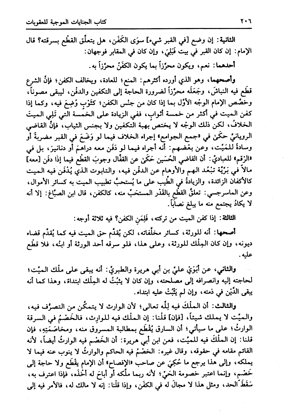 وأصحهما، وهو الذي أورده أكثرهم: المنع؛ للعادة، ويخالف الكفن؛ فإنَّ الشرع قطَع فيه النباشَ، وجَعَلَه محرَّزاً لضرورة الحاجة إلى التكفين والدفْن، ليبقى مصوناً، وخصَّص الإِمام الوجْه الأوَّل بما إذا كان من جنْس الكفن؛ كثَوْب وُضِعَ فيه، وكما إذا كفن الميت في أكثر من خمسة أثوابٍ، ففي الزيادة على الخمسة التي تَلِي الميتَ الخلافُ، لكن ذلك الوجْه لا يختص بهبة التكفين ولا بجنس الثياب، فإنَّ القاضي الرويانيِّ حكَى في "جمع الجوامع" إجراء الخلاف فيما لو وَضَعَ في القبر مضربةً أو وسادةً للمَيِّت، وعن بعْضهم: أنه أجراه فيما لو دَفَن معه دراهمَ أو دنانيرَ، بل في "الرْقم" للعباديِّ: أن القاضي الحُسَيْن حَكَى عن القفَّال وجوبَ القطْع فيما إذا دفَن [معه] مالاً في بَرِّيَّة تبْعُد الهم والأوهام عن الدفْن فيه، والتابوت الذي يُدْفَن فيه الميت كالأكفان الزائدة، والزيادةُ في الطِّيب على ما يُستحبُّ تطبيب الميت به كسائر الأموال، وعن الماسرجسي: تعلقُّ القطْعِ بالقَدْر المستحَبِّ منه، كالكفن، قال ابن الصبَّاغ: إلا أنه لا يكادُ يجتمع منه ما يبلغ نصاباً.