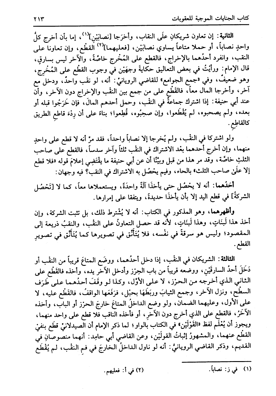 الثالثة: الشريكان في النقْب، إذا دخل أحدُهما، ووضَع المتاعَ قريباً من النقْب أو دَخَلَ أحدُ السارقَيْنِ، ووضعه قريباً من باب الحِرْز وأدخل الآخر يده، وأخذه فالقَطْع على الثاني الذي أخرجه من الحرْز، لا على الأوَّل، وكذا لو وقَفَ أحدُهما على طَرَف السطْح، ونزل الآخر، وجمع الثيابَ وربَطَهَا بحبْل، فرَفَعَها الواقفُ، فالقَطْع عليه، لا على الأول، وعليهما الضمان، ولو وضع الداخلُ المتاعَ خارجَ الحرْز أو الباب، وأخذه الآخَرُ، فالقطع على الذي أخرج دون الآخرِ، أو فأخذه المناقب فلا قطع على واحد منهما، ويجوز أن يُعْلَم لفظ "القَوْلَيْن" في الكتاب بالواو؛ لما ذكر الإِمام أن الصيدلانيِّ قطَع بنفيْ القطْع عنهما، والمشهورُ إثباتُ القولَيْن، وعن القاضي أبي حامِد: أنهما منصوصانِ في القديم، وذكر القاضي الرويانيُّ: أنه لو ناول الداخلُ الخارجَ في فمِ النقْب، لم يُقْطَع