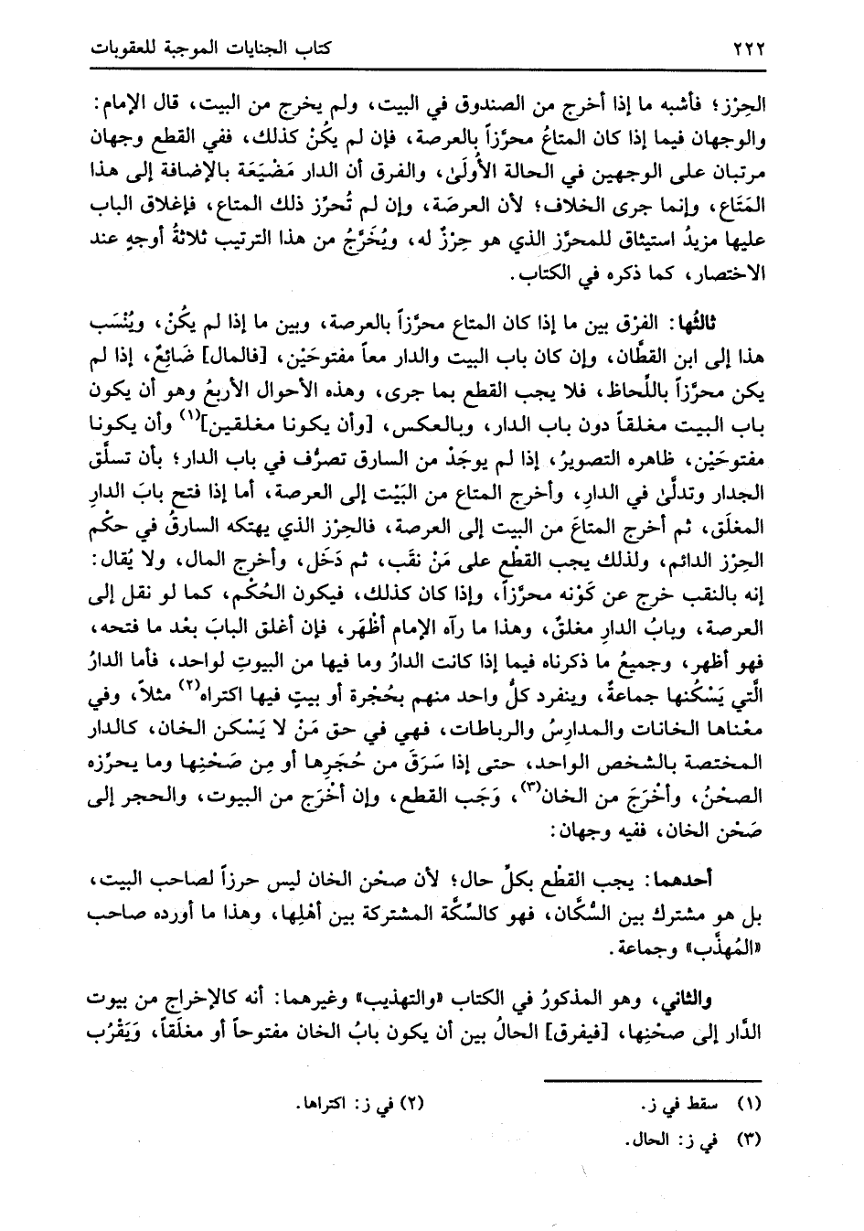 ثالثُها: الفرْق بين ما إذا كان المتاع محرَّزاً بالعرصة، وبين ما إذا لم يكُنْ، ويُنْسَب هذا إلى ابن القطَّان، وإن كان باب البيت والدار معاً مفتوحَيْن، [فالمال] ضَائِعٌ، إذا لم يكن محرَّزاً باللِّحاظ، فلا يجب القطع بما جرى، وهذه الأحوال الأربعُ وهو أن يكون باب البيت مغلقاً دون باب الدار، وبالعكس، [وأن يكونا مغلقين] (¬1) وأن يكونا مفتوحَيْن، ظاهره التصويرُ، إذا لم يوجَدْ من السارق تصرُّف في باب الدار؛ بأن تسلَّق الجدار وتدلَّى في الدارِ، وأخرج المتاع من البَيْت إلى العرصة، أما إذا فتح بابَ الدارِ المغلَق، ثم أخرج المتاعَ من البيت إلى العرصة، فالحِرْز الذي يهتكه السارقُ في حكْم الحِرْز الدائم، ولذلك يجب القطْع على مَنْ نقَب، ثم دَخَل، وأخرج المال، ولا يُقال: إنه بالنقب خرج عن كَوْنه محرَّزاً، وإذا كان كذلك، فيكون الحُكْم، كما لو نقل إلى العرصة، وبابُ الدارِ مغلقٌ، وهذا ما رآه الإِمام أظْهَر، فإن أغلق البابَ بعْد ما فتحه، فهو أظهر، وجميعُ ما ذكرناه فيما إذا كانت الدارُ وما فيها من البيوتِ لواحد، فأما الدارُ الَّتي يَسْكُنها جماعةٌ، وينفرد كلُّ واحد منهم بحُجْرة أو بيتٍ فيها اكتراه (¬2) مثلاً، وفي معْناها الخانات والمدارِسُ والرباطات، فهي في حق مَنْ لا يَسْكن الخان، كالدار المختصة بالشخص الواحد، حتى إذا سَرَقَ من حُجَرِها أو مِن صَحْنِها وما يحرِّزه الصحْنُ، وأخْرَجَ من الخان (¬3)، وَجَب القطع، وإن أخْرَج من البيوت، والحجر إلى صَحْن الخان، ففيه وجهان: