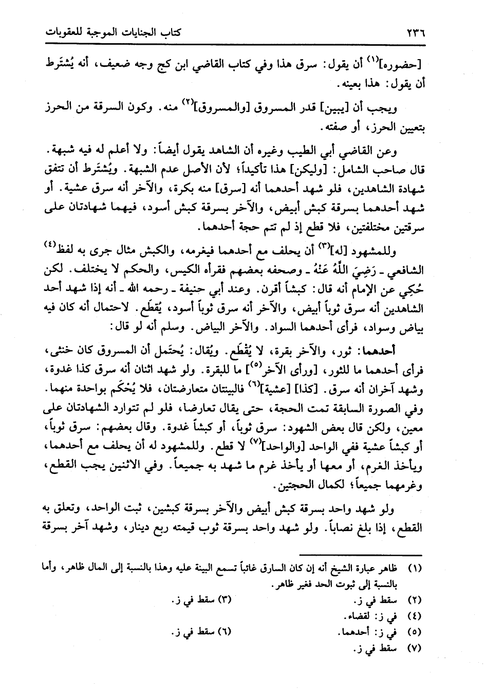(¬1) ظاهر عبارة الشيخ أنه إن كان السارق غائباً تسمع البينة عليه وهذا بالنسبة إلى المال ظاهر، وأما بالنسبة إلى ثبوت الحد فغير ظاهر.