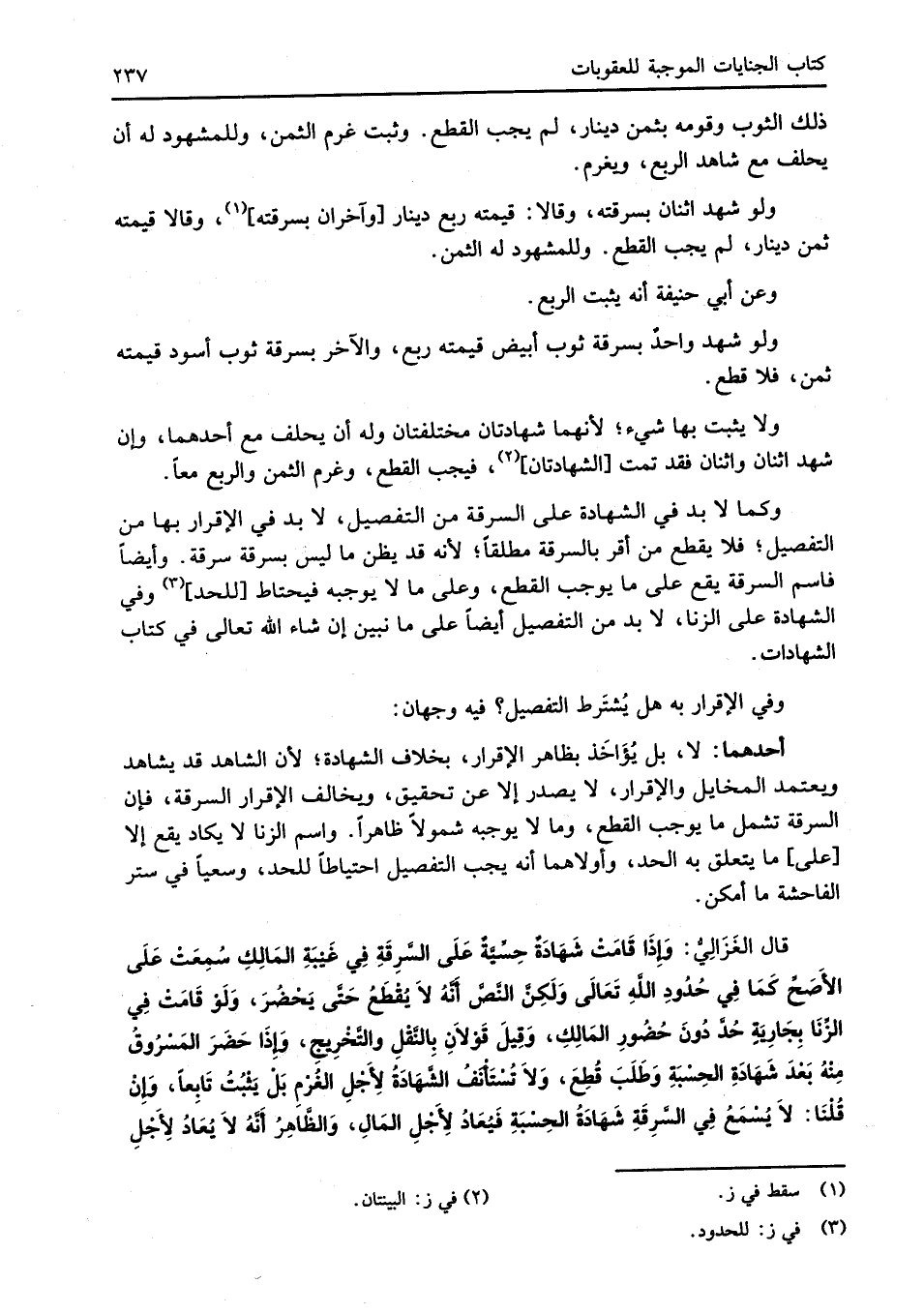 قال الْغَزَالِيُّ: وَإِذَا قَامَتْ شَهَادَةٌ حِسِّيَّةْ عَلَى السَّرِقَةِ في غَيْبَةِ المَالِكِ سُمِعَتْ عَلَى الأَصَحِّ كَمَا فِي حُدُودِ اللهِ تَعَالَى وَلَكِنَّ النَّصَّ أنَّهُ لاَ يُقْطَعُ حتَّى يَحْضُرَ، وَلَوْ قَامَتْ في الزِّنَا بِجَارِيةٍ حُدَّ دُونَ حُضُورِ المَالِكِ، وَقِيلَ قَوْلاَنِ بِالنَّقْلِ والتَّخْرِيجِ، وَإِذَا حَضَرَ المَسْرُوقُ مِنْهُ بعْدَ شَهَادَةِ الحِسْبَةِ وَطَلَبَ قُطِعَ، وَلاَ تُسْتَأْنفُ الشَّهَادَةُ لِأَجْلِ الغُرْمِ بَلْ يَثْبُتُ تَابِعاً، وَإِنْ قُلْنَا: لاَ يُسْمَعُ فِي السَّرِقَةِ شَهَادَةُ الحِسْبَةِ فَيُعَادُ لِأَجْلِ المَالِ، وَالظَّاهِرُ أَنَّهُ لاَ يُعَادُ لِأجْلِ