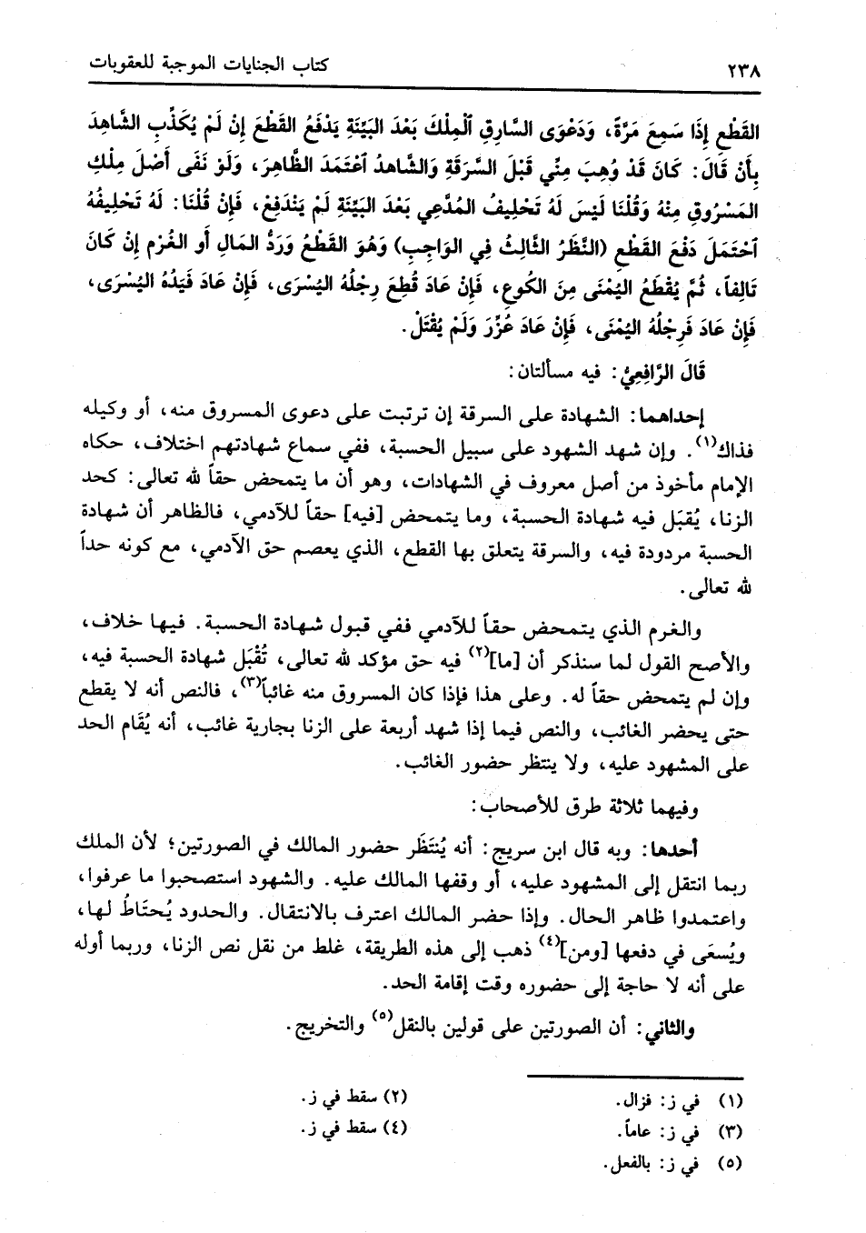 القَطْعِ إِذَا سَمِعَ مَرَّةً، وَدَعْوَى السَّارِقِ الْمِلْكَ بَعْدَ البَيِّنَةِ يَدْفَعُ القَطْعَ إنْ لَمْ يُكَذِّبِ الشَّاهِدَ بِأَنْ قَالَ: كَانَ قَدْ وْهِبَ مِنِّي قَبْلَ السَّرَقَةِ وَالشَّاهدُ اعْتَمَدَ الظَّاهِرَ، وَلَوْ نَفَى أَصْلَ مِلْكِ المَسْرُوقِ مِنْهُ وَقُلْنَا لَيْسَ لَهُ تَحْلِيفُ المُدَّعِي بَعْدَ البَيِّنَةِ لَمْ يَنْدَفعْ، فَإنْ قُلْنَا: لَهُ تَحْلِيفُهُ احْتَمَلَ دَفْعَ القَطْعِ (النَّظَرُ الثَّالِثُ فِي الوَاجِبِ) وَهُوَ القَطْعُ وَرَدُّ المَالِ أَو الغُرْم إنْ كَانَ تَالِفاً، ثمَّ يُقْطَعُ اليُمْنَى مِنَ الكُوعِ، فَإنْ عَادَ قُطِعَ رِجْلُهُ اليُسْرَى، فَإِنْ عَادَ فَيَدُهُ اليُسْرَى، فَإنْ عَادَ فَرِجْلُهُ اليُمْنَى، فَإِنْ عَادَ عُزِّرَ وَلَمْ يُقْتَلْ.