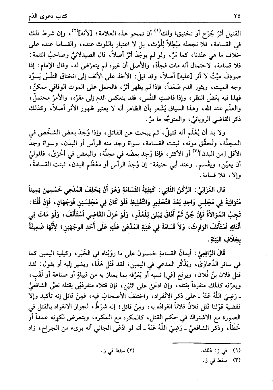 قال الغَزَالِيُّ: الرُّكْنُ الثَّانِي: كَيْفِيَّةُ القَسَامَةِ وَهُوَ أَنْ يَحْلِفَ المُدَّعِي خَمْسِينَ يَمِيناً مُتَوالِيَةً فِي مَجْلِسٍ وَاحِدٍ بَعْدَ التَّحْذِيرِ والتَّغْلِيظِ فَلَوْ كَانَ فِي مَجْلِسَيْنِ فَوَجْهَانِ، فَإِنْ قُلْنَا: تَجِبُ المُوَالاةُ فَإِنْ جُنَّ ثُمَّ أَفَاقَ يُبْنَى لِلْعُذْرِ، وَلَوْ عُزِلَ القَاضِي اسْتَأْنَفَ، وَلَوْ مَاتَ فِي أَثْنَائِهِ اسْتَأْنَفَ الوَارِثُ، وَلاَ قَسَامَةَ فِي غَيْبَةِ المُدَّعَى عَلَيْهِ عَلَى أَحَدِ الوَجْهَيْنِ؛ لأَنَّهَا ضَعِيفَةٌ بِخِلافِ البَيِّنَةِ.