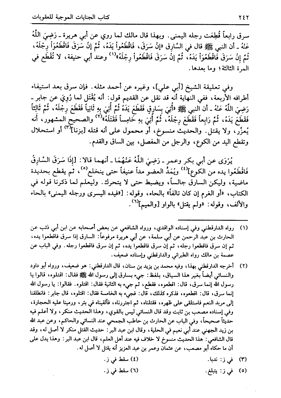 سرق رابعاً قُطِعَت رجله اليمنى. وبهذا قال مالك لما روي عن أبي هريرة -رَضِيَ اللهُ عَنْهُ- أن النبي -صلى الله عليه وسلم- قال في السَّارِق "إنْ سَرَقَ، فَاقْطَعُوا يَدَهُ، ثُمَّ إنْ سَرَقَ فَاقْطَعُوَا رِجْلَهُ، ثُمَّ إِنْ سَرَقَ فَاقْطَعُوَاْ يَدَهُ، ثُمَّ إنْ سَرَقَ فَاقْطَعُواْ رجْلَهُ" (¬1) وعند أبي حنيفة، لا تُقْطَع في المرة الثالثة؛ وما بعدها.