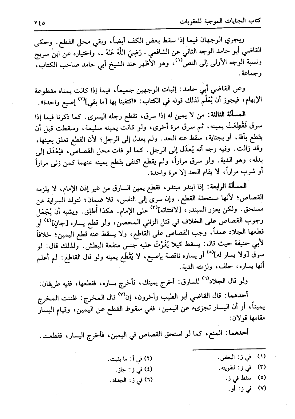 المسألة الرابعة: إذا ابتدر مبتدر، فقطع يمين السارق من غير إذن الإِمام، لا يلزمه القصاص؛ لأنها مستحقة القطع. وإن سرى إلى النفس، فلا ضمان؛ لتولد السراية عن مستحق. ولكن يعزر المبتدر، [لافتئاته] (¬3) على الإِمام. هكذا أُطلِق. ويشبه أن يُجْعَل وجوب القصاص على الخلاف في قتل الزاني المحصن، ولو قطع يساره [جانٍ] (¬4) أو قطعها الجلاد عمداً، وجب القصاص على القاطع، ولا يسقط عنه قطع اليمين؛ خلافاً لأبي حنيفة حيث قال: يسقط كيلا يُفَوَّتُ عليه جنس منفعة البطش. ولذلك قال: لو سرق [ولا يسار له] (¬5) أو يساره ناقصة بإصبع، لا يُقْطَع يمينه ولو قال القاطع: لم أعلم أنها يساره، حلف، ولزمته الدية.