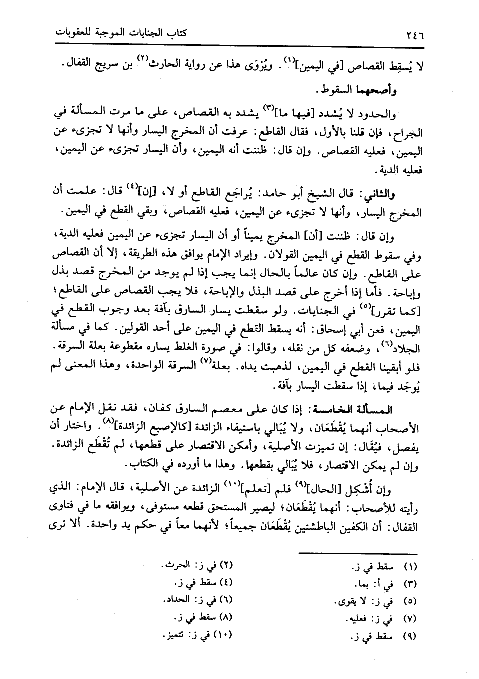 المسألة الخامسة: إذا كان على معصم السارق كفان، فقد نقل الإِمام عن الأصحاب أنهما يُقْطَعَان، ولا يُبَالي باستيفاء الزائدة [كالإصبع الزائدة] (¬8). واختار أن يفصل، فيُقَال: إن تميزت الأصلية، وأمكن الاقتصار على قطعها، لم تُقْطَع الزائدة. وإن لم يمكن الاقتصار، فلا يُبَالي بقطعها. وهذا ما أورده في الكتاب.