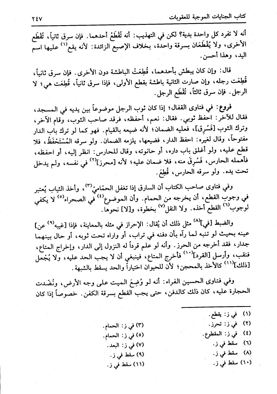 وفي فتاوى صاحب الكتاب أن السارق إذا تغفل الحمّاميّ (¬3)، وأخذ الثياب يُعتبر في وجوب القطع، أن يخرجه من الحمام. وأن الموضوع (¬4) في الصحراء (¬5) لا يكفي لوجوب (¬6) القطع أخذه. ولا النقل (¬7) بخطوة، و [لا] نحوها.