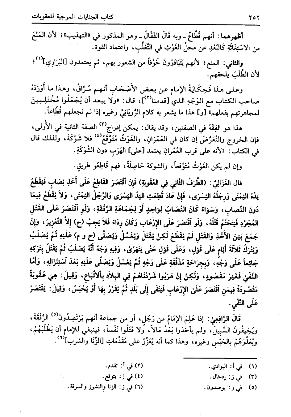 قال الغَزَالِيُّ: (الطَّرَفُ الثَّانِي فِي العُقُوَبَةِ) فَإِنْ اَقْتَصَرَ القَاطِعُ عَلَى أَخْذِ نِصَابٍ فَيُقْطَعُ يَدُهُ اليُمْنَى وَرِجْلُهُ اليُسْرَى، فَإِنْ عَادَ قُطِعَتِ اليَدُ اليُسْرَى وَالرِّجْلُ اليُمْنَى، وَلاَ يُقْطَعُ فِيمَا دُونَ النِّصابِ، وَسَوَاءٌ كَانَ النِّصَابُ لِواحِدٍ أَوْ لِجَمَاعَةِ الرُّفْقَةِ، وَلَوِ اقْتَصَرَ عَلَى القَتْلِ المُجَرَّدِ فَيَتَحَتَّمُ قَتْلُهُ، وَلَو اقْتَصَرَ عَلَى الإِرْعَاب وَكَانَ رِدَاءً فَلاَ يَجِبُ (ح) إِلاَّ التَّعْزِيرُ، وَإِنْ جَمَعَ بَيْنَ الأَخْذِ وَالقَتْلِ لَمْ يُقْطَعْ لَكِنْ يُقْتَلْ وَيُغَسَّلُ وَيُصَلَّى (ح وم) عَلَيْهِ ثُمَّ يُصْلَبُ وُيُتْرَكُ ثَلاَثَةَ أَيَّامٍ عَلَى قَوْلٍ، وَعَلَى قَوْلٍ حَتَّى يَتَهَرَّى، وَفِيهِ وَجْهٌ أنَّهُ يُصْلَبُ ثُمَّ يُقْتَل بِتَرْكِهِ جَائِعًا عَلَى وَجْهٍ، وَبِجِرَاحَةٍ مُذَفَّفَةٍ عَلَى وَجْهٍ ثُمَّ يُغَسَّلُ وَيُصَلَّى عَلَيهِ بَعْدَ اسْتِنْزَالِهِ، وَأَمَّا النَّفْيُ فَغَيْرُ مَقصُودٍ، وَلَكِنْ إِنْ هَرَبُوا شَرَّدْنَاهُمْ في البِلاَدِ بِالاتِّبَاعِ، وَقِيلَ: هِيَ عُقوبَةٌ مَقْصُودَةٌ فِيمَنِ اقْتَصَرَ عَلَى الإِرْعَابِ فَيُنْفَى إِلَى بَلَدٍ ثُمَّ يُقَرَّرُ بِهَا أَو يُحْبَسُ، وَقِيلَ: يُقْتَصَرُ عَلَى النَّفْيِ.