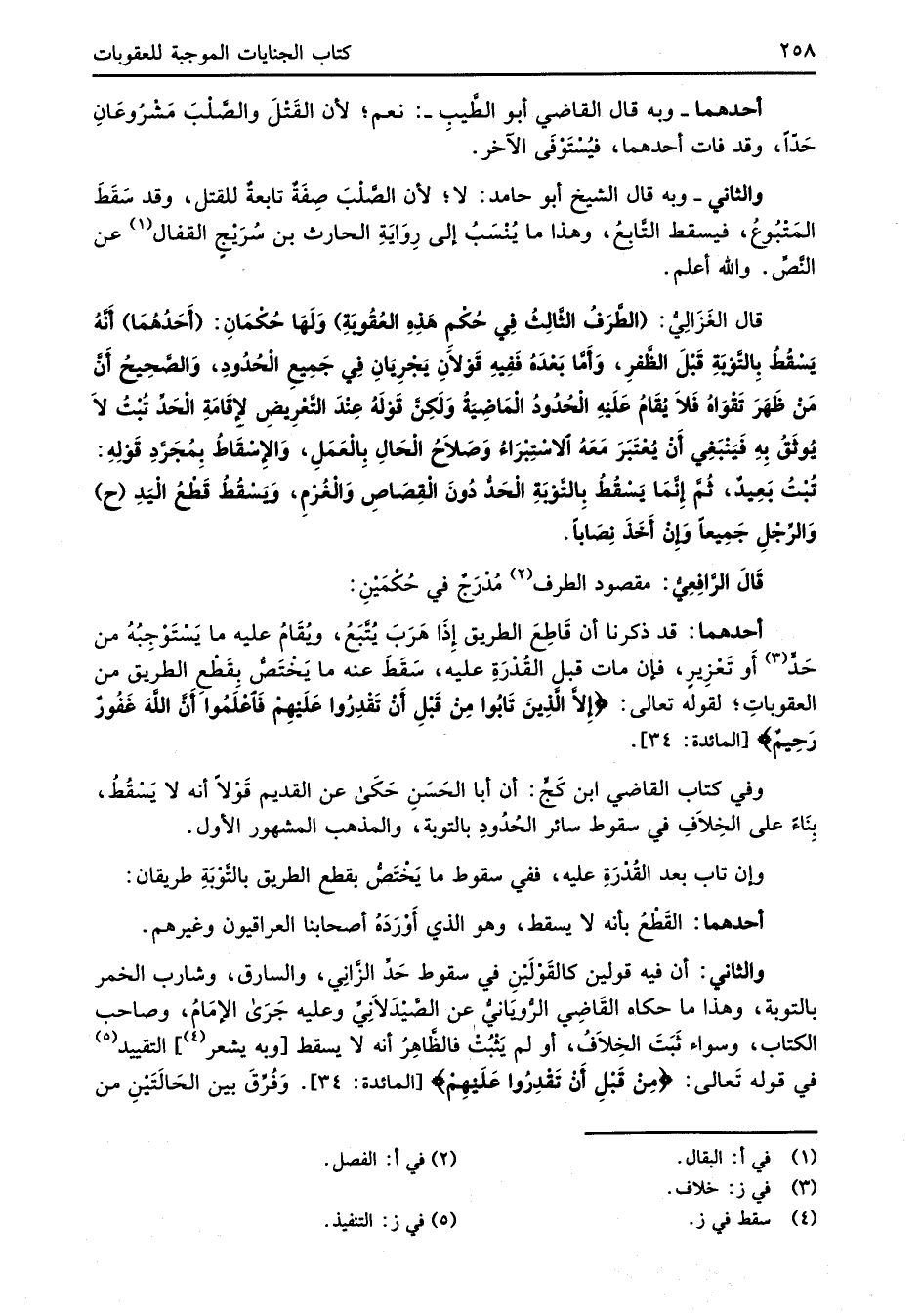 قال الغَزَالِيُّ: (الطَّرَفُ الثَّالِثُ فِي حُكْمِ هَذِهِ العُقُوبَةِ) وَلَهَا حُكْمَانِ: (أَحَدُهُمَا) أَنَّهُ يَسْقُطُ بِالتَّوْبَةِ قَبْلَ الظَّفرِ، وَأَمَّا بَعْدَهُ فَفِيهِ قَوْلاَنِ يَجْرِيَانِ فِي جَمِيعِ الْحُدُودِ، وَالصَّحِيحُ أَنَّ مَنْ ظَهَرَ تَقْوَاهُ فَلاَ يُقَامُ عَلَيْهِ الْحُدُودُ الْمَاضِيَةُ وَلَكِنَّ قَوْلَهُ عِنْدَ التَّعْرِيضِ لإِقَامَةِ الْحَدِّ تُبْتُ لاَ يُوثَقُ بِهِ فَيَنْبَغِي أَنْ يُعْتَبَرَ مَعَهُ الاسْتِبْرَاءُ وَصَلاَحُ الْحَالِ بِالْعَمَلِ، وَالإِسْقَاطُ بِمُجَرَّدِ قَوْلِهِ: تُبْتُ بَعِيدٌ، ثُمَّ إِنَّمَا يَسْقُطُ بِالتَّوْبَةِ الْحَدُّ دُونَ الْقِصَاصِ وَالْغُرْمِ، وَيَسْقُطُ قَطْعُ الْيَدِ (ح) وَالرِّجْلِ جَمِيعًا وَإِنْ أَخَذَ نِصَابًا.