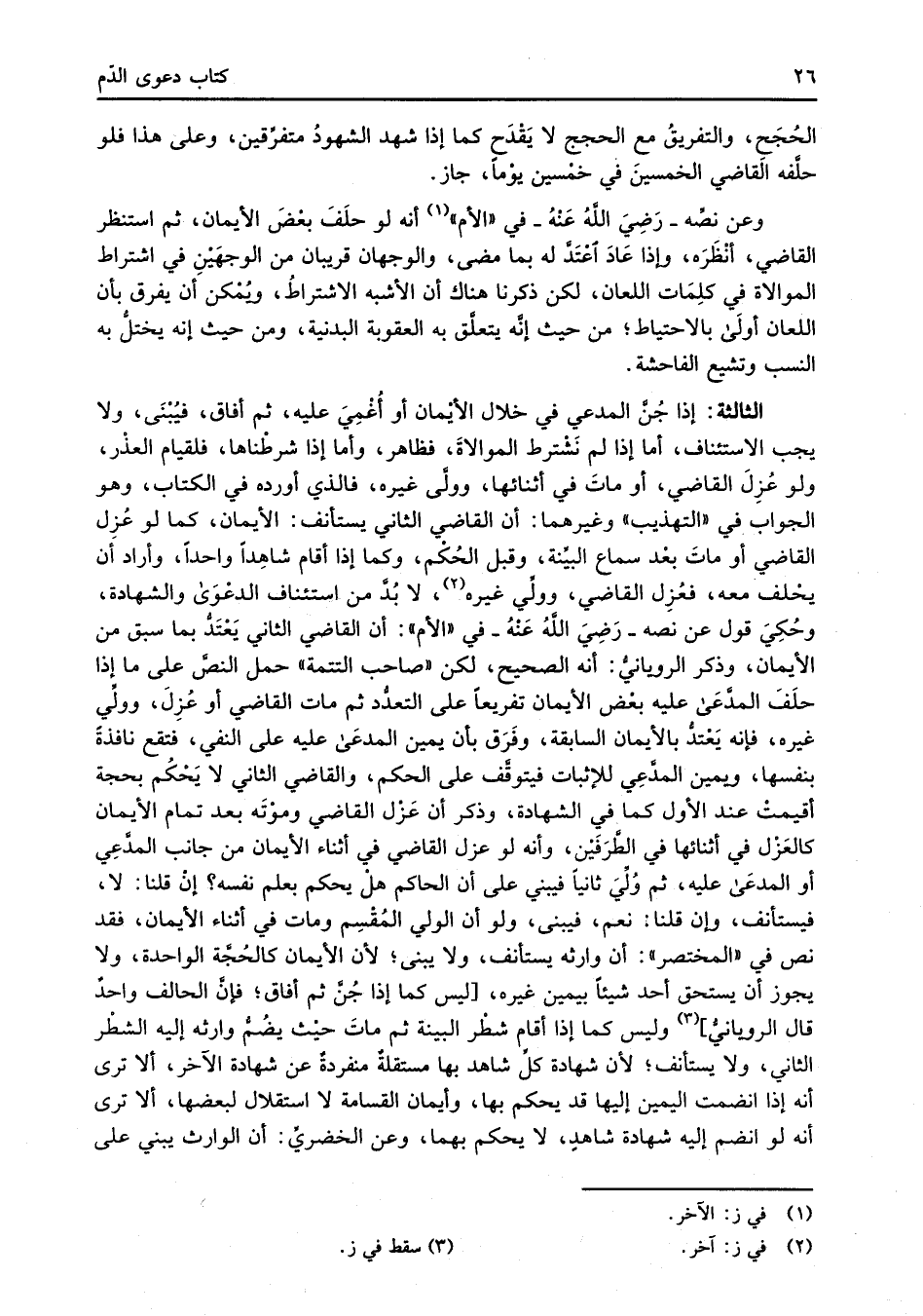 الثالثة: إذا جُنَّ المدعي في خلال الأيْمان أو أُغْمِيَ عليه، ثم أفّاق، فيُبْنَى، ولا يجب الاستئناف، أما إذا لم نَشْترط الموالاةَ، فظاهر، وأما إذا شرطْناها، فلقيام العذْر، ولو عُزِلَ القاضي، أو ماتَ في أثنائها، وولَّى غيره، فالذي أورده في الكتاب، وهو الجواب في "التهذيب" وغيرهما: أن القاضي الثاني يستأنف: الأيمان، كما لو عُزِل القاضي أو ماتَ بعْد سماع البيَّنة، وقبل الحُكْم، وكما إذا أقام شاهِداً واحدًا، وأراد أن يحْلف معه، فعُزِل القاضي، وولي غيره (¬2)، لا بُدَّ من استئناف الدعْوَى والشهادة، وحُكِيَ قول عن نصه -رَضِيَ اللهُ عَنْهُ- في "الأم": أن القاضي الثاني يَعْتَدُّ بما سبق من الأيمان، وذكر الرويانيُّ: أنه الصحيح، لكن "صاحب التتمة" حمل النص على ما إذا حلَفَ المدَّعَى عليه بعْض الأيمان تفريعاً على التعدُّد ثم مات القاضي أو عُزِلَ، وولِّي غيره، فإنه يَعْتدُّ بالأيمان السابقة، وفَرَق بأن يمين المدعَى عليه على النفي، فتقع نافذةً بنفسها، ويمين المدَّعِي للإثبات فيتوقَّف على الحكم، والقاضي الثاني لا يَحْكُم بحجة أقيمتْ عند الأول كما في الشهادة، وذكر أن عَزْل القاضي وموْتَه بعد تمام الأيمان كالعَزْل في أثنائها في الطَّرَفَيْن، وأنه لو عزل القاضي في أثناء الأيمان من جانب المدَّعِي أو المدعَى عليه، ثم وُلِّيَ ثانيًا فيبني على أن الحاكم هلْ يحكم بعلم نفسه؟ إنْ قلنا: لا، فيستأنف، وإن قلنا: نعم، فيبنى، ولو أن الولي المُقْسِم ومات في أثناء الأيمان، فقد نص في "المختصر": أن وارثه يستأنف، ولا يبنى؛ لأن الأيمان كالحُجَّة الواحدة، ولا يجوز أن يستحق أحد شيئًا بيمين غيره، [ليس كما إذا جُنَّ ثم أفاق؛ فإنَّ الحالف واحدٌ قال الرويانيُّ] (¬3) وليس كما إذا أقام شطْر البينة ثم ماتَ حيْث يضُمُّ وارثه إليه الشطْر الثاني، ولا يستأنف؛ لأن شهادة كلِّ شاهد بها مستقلةٌ منفردةٌ عن شهادة الآخر، ألا ترى أنه إذا انضمت اليمين إليها قد يحكم بها، وأيمان القسامة لا استقلال لبعضها، ألا ترى أنه لو انضم إليه شهادة شاهدٍ, لا يحكم بهما، وعن الخضريِّ: أن الوارث يبني على