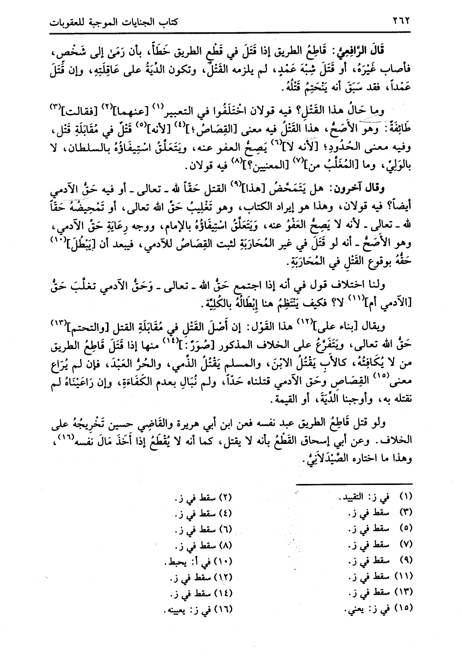 قَالَ الرَّافِعِيُّ: قَاطِعُ الطريق إذا قَتَلَ في قَطْعِ الطريق خَطَأً، بأن رَمَى إلى شَخْصٍ، فأصاب غَيْرَهُ، أو قَتَلَ شِبْهَ عَمْدٍ، لم يلزمه القَتْلُ، وتكون الدِّيَةُ على عَاقِلَتِهِ، وإن قَتَلَ عَمْدًا، فقد سَبَقَ أنه يَنْحَتِمُ قَتْلُهُ.