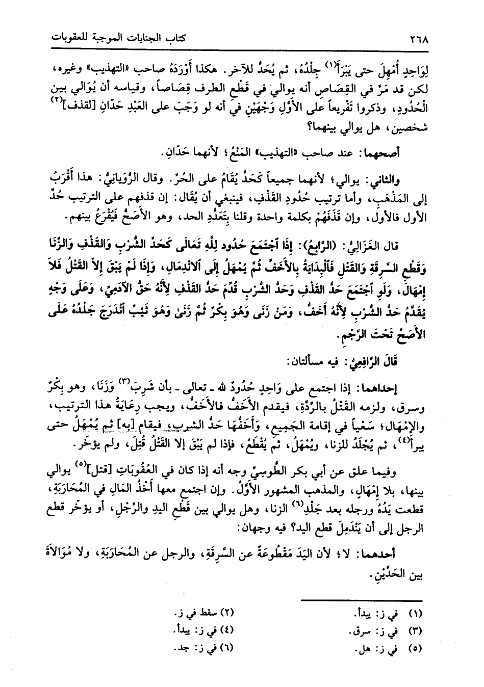 وفيما علق عن أبي بكر الطُّوسِيِّ وجه أنه إذا كان في العُقُوبَاتِ [قتل] (¬5) يوالي بينها، بلا إِمْهَالٍ، والمذهب المشهور الأَوَّلُ. وإن اجتمع معها أَخْذُ المَالِ في المُحَارَبَةِ، قطعت يَدُهُ ورجله بعد جَلْدِ (¬6) الزنا، وهل يوالي بين قَطْعِ اليدِ والرِّجْلِ، أو يؤخّر قطع الرجل إلى أن يَنْدَمِلَ قطع اليد؟ فيه وجهان: