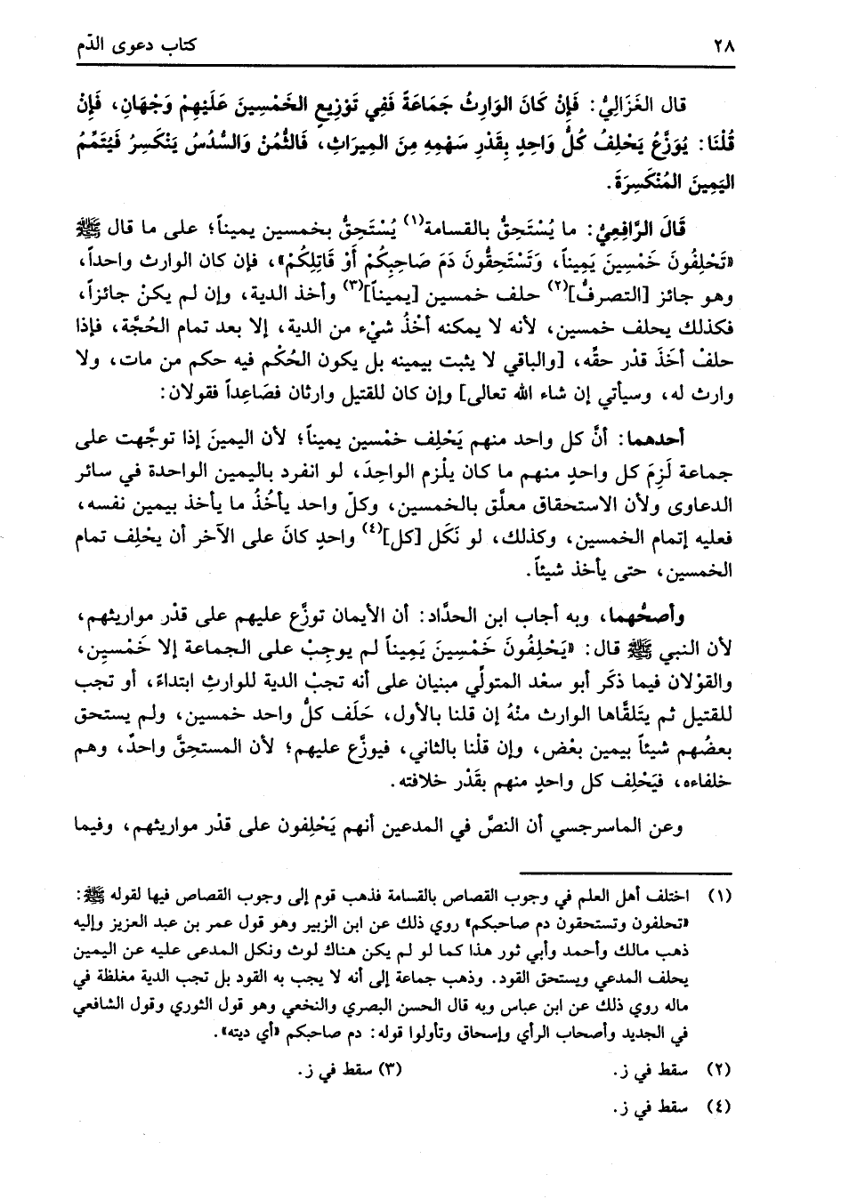 قال الغَزَالِيُّ: فَإنْ كَانَ الوَارِثُ جَمَاعَةً فَفِي تَوْزِيع الخَمْسِينَ عَلَيْهِمْ وَجْهَانِ، فَإنْ قُلْنَا: يُوَزَّعُ يَحْلِفُ كُلُّ وَاحِدٍ بِقَدْرِ سَهْمِهِ مِنَ المِيرَاثِ، فَالثُّمُنْ والسُّدُسُ يَنْكَسِرُ فَيُتَمِّمُ اليَمِينَ المُنْكَسِرَةَ.