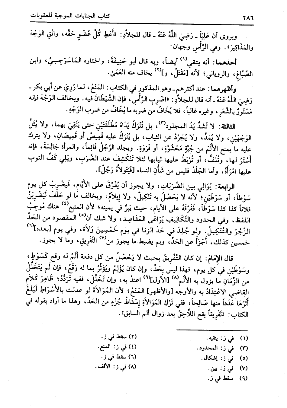 ويروى أن عَلِيّاً -رَضِيَ اللهُ عَنْهُ- قال للجلاَّدِ: "أَعْطِ كُلَّ عُضْوٍ حَقَّه، واتَّقِ الوَجْهَ والمَذَاكِيرَ". وفي الرَّأْسِ وجهان: