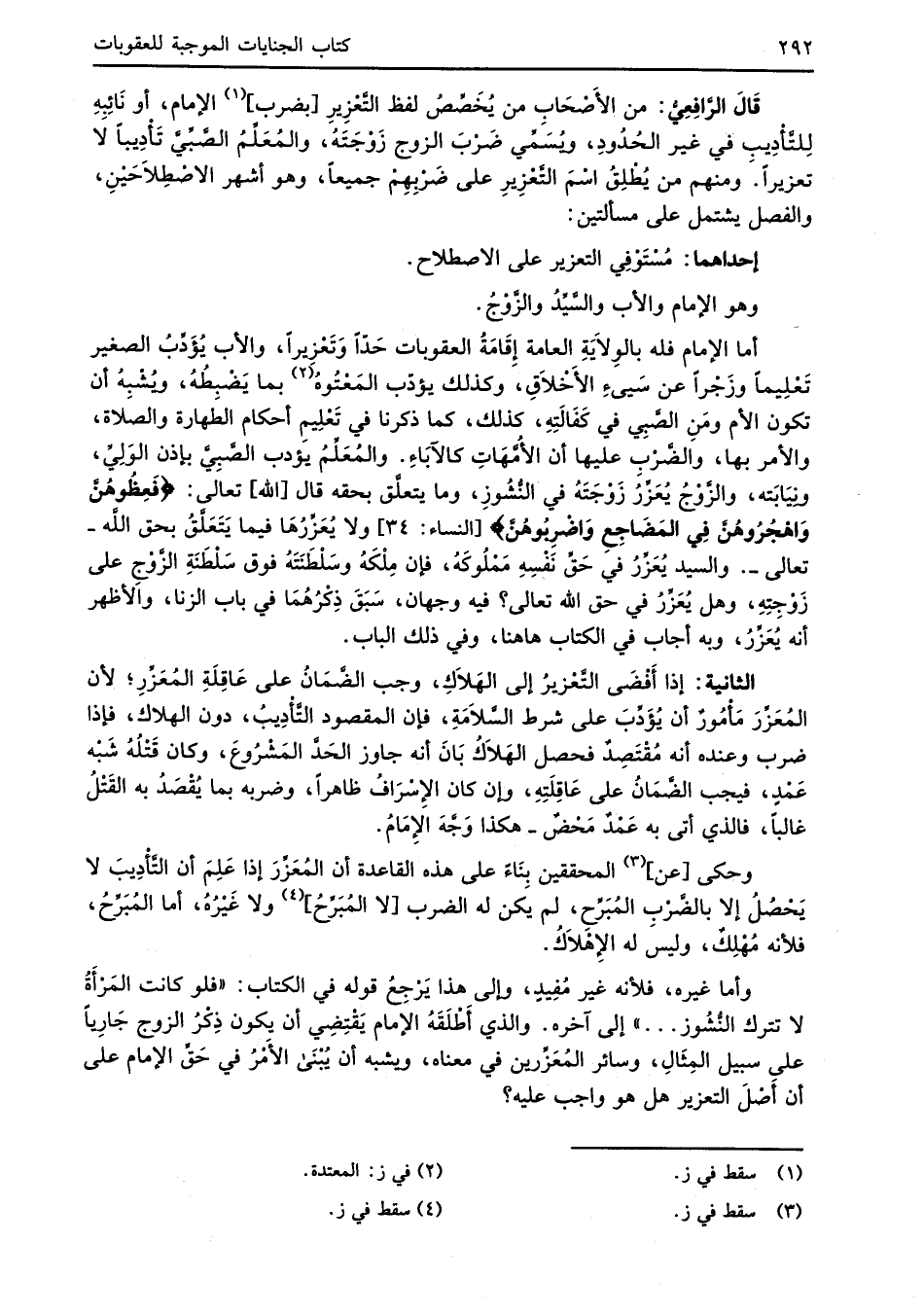 أما الإِمام فله بالوِلاَيَةِ العامة إِقَامَةُ العقوبات حَدّاً وَتَعْزيراً، والأب يُؤَدِّبُ الصغير تَعْلِيماً وزَجْراً عن سَيئِ الأَخْلاَقِ، وكذلك يؤدّب المَعْتُوهُ (¬2) بما يَضْبِطُهُ، ويُشْبِهُ أن تكون الأم ومَنِ الصَّبِي في كَفَالَتِهِ، كذلك، كما ذكرنا في تَعْلِيمِ أحكام الطهارة والصلاة، والأمر بها، والضَّرْب عليها أن الأمَّهَاتِ كالآبَاءِ. والمُعَلِّمُ يؤدب الصَّبِيَّ بإذن الوَلِيِّ، ونِيَابَته، والزَّوْجُ يُعزِّرُ زَوْجَتَهُ في النُّشُوزِ، وما يتعلَّق بحقه قال [الله] تعالى: {فَعِظُوهُنَّ وَاهْجُرُوهُنَّ فِي الْمَضَاجِعِ وَاضْرِبُوهُنَّ} [النساء: 34] ولا يُعَزِّرُهَا فيما يَتَعَلَّقُ بحق الله -تعالى-. والسيد يُعَزِّرُ في حَقِّ نَفْسِهِ مَمْلُوكَهُ، فإن مِلْكَهُ وسَلْطَنَتَهُ فوق سَلْطَنَةِ الزَّوْجِ على زَوْجِتِهِ، وهل يُعَزِّرُ في حق الله تعالى؟ فيه وجهان، سَبَقَ ذِكْرُهُمَا في باب الزنا، والأظهر أنه يُعَزِّرُ، وبه أجاب في الكتاب هاهنا، وفي ذلك الباب.