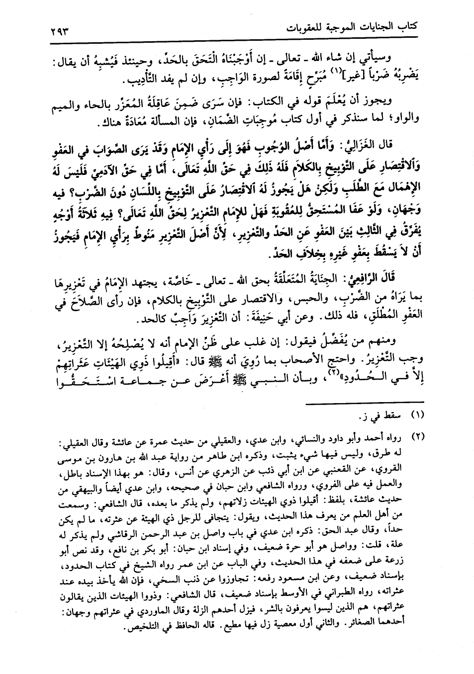 قال الغَزَالِيُّ: وَأَمَّا أَصْلُ الوُجُوبِ فَهُوَ إِلَى رَأْيِ الإِمَامِ وَقَدْ يَرَى الصَّوَابَ في العَفْوِ وَالاقْتِصَارِ عَلَى التَّوْبِيخِ بِالكلام فَلَهُ ذَلِكَ فِي حَقِّ اللَّهِ تَعَالَى، أَمَّا فِي حَقِّ الآدَمِيِّ فَلَيْسَ لَه الإِهْمَال مَعَ الطَّلَبِ وَلَكِنْ هَلْ يَجُوزُ لَهُ الاقْتِصَارُ عَلَى التَّوْبِيخِ بِاللِّسَانِ دُونَ الضَّرْبِ؟ فيه وَجْهَانِ، وَلَوْ عَفَا المُسْتَحِقُّ لِلعُقُوبَةِ فَهَلْ للإمَامِ التَّعْزِيرُ لِحَقِّ اللهِ تَعَالَى؟ فِيهِ ثَلاَثةُ أَوْجُهٍ يُفَرَّق فِي الثَّالِثِ بَيْنَ العَفْوِ عَنِ الحَدِّ والتَّعْزِيرِ، لِأَنَّ أَصْلَ التَّعْزِيرِ مَنُوطٌ بِرَأْيِ الإِمَامِ فَيَجُوزُ أَنْ لاَ يَسْقُطَ بِعَفْوِ غَيْرِهِ بِخِلاَفِ الحَدِّ.