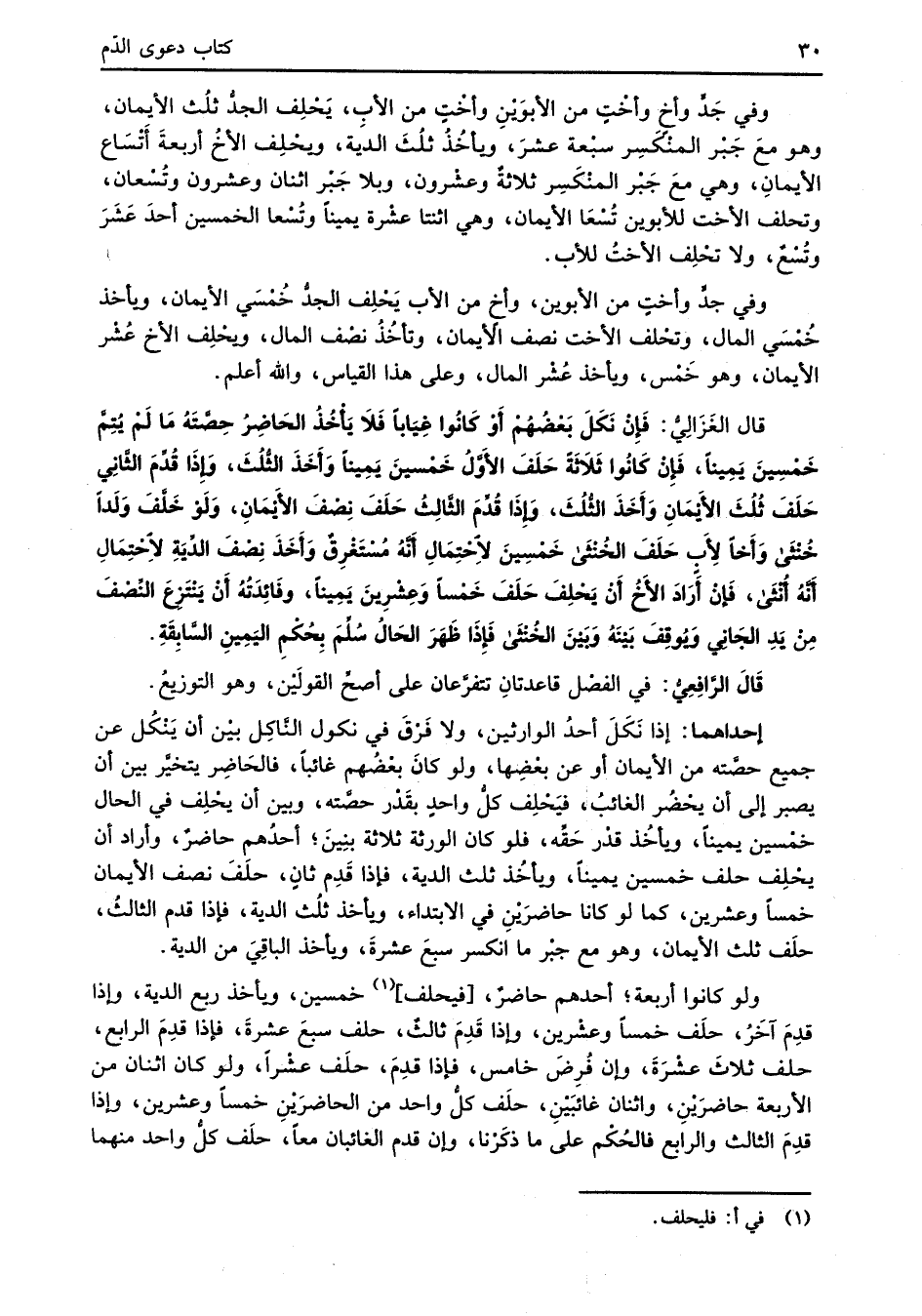 قال الغَزَالِيُّ: فَإِنْ نَكَلَ بَعْضُهُمْ أَوْ كَانُوا غِيَابًا فَلا يَأْخُذُ الحَاضِر حِصَّتَهُ مَا لَمْ يُتِمَّ خَمْسِينَ يَمِيناً، فَإِنْ كَانُوا ثَلاثَةً حَلَفَ الأَوَّلُ خَمْسينَ يَمِيناً وَأَخَذَ الثُّلُثَ، وَإِذَا قُدِّمَ الثَّانِي حَلَفَ ثُلُثَ الأَيْمَانِ وَأَخَذَ الثُّلُثَ، وَإِذَا قُدِّمَ الثَّالِثُ حَلَفَ نِصْفَ الأَيْمَانِ، وَلَوْ خَلَّفَ وَلَداً خُنْثَى وَأَخاً لأَبٍ حَلَفَ الخُنْثىَ خَمْسِينَ لاحْتِمَالِ أنَّهُ مُسْتَغْرِقٌ وَأَخَذَ نِصْفَ الدِّيَةِ لاِحْتِمَالِ أنَّهُ أُنْثَى، فَإنْ أَرَادَ الأَخُ أَنْ يَحْلِفَ حَلَفَ خَمْساً وَعِشْرِينَ يَمِيناً، وفَائِدَتُهُ أَنْ يَنْتَزِعَ النِّصْفَ مِنْ يَدِ الجَاني وَيُوقِفَ بَيْنَهُ وَبَيْنَ الخُنْثَى فَإِذَا ظَهَرَ الحَالُ سُلِّمَ بِحُكْمِ اليَمِينِ السَّابِقَةِ.