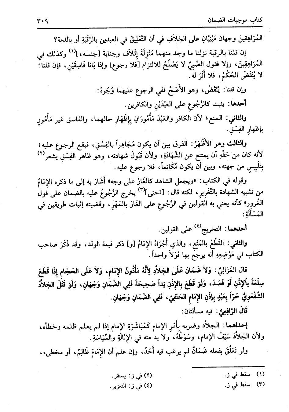 قال الغَزَالِيُّ: وَلاَ ضَمَانَ عَلَى الجَلاَّدِ لِأَنَّهُ مَأْذُونُ الإِمَامِ، وَلاَ عَلَى الحَجَّامِ إِذَا قَطَعَ سِلْعَةً بالإِذْنِ أَوْ فَصَدَ، وَلَو قَطَعَ بِالإِذْنِ يَداً صَحِيحَةً فَفِي الضَّمَانِ وَجْهَانِ، وَلَوْ قَتَلَ الجَلاَّدُ الشَّفْعَوِيُّ حُرّاً بِعَبْدٍ بِإذْنِ الإمَامِ الحَنَفِيِّ، فَفِي الضَّمَانِ وَجْهَانِ.