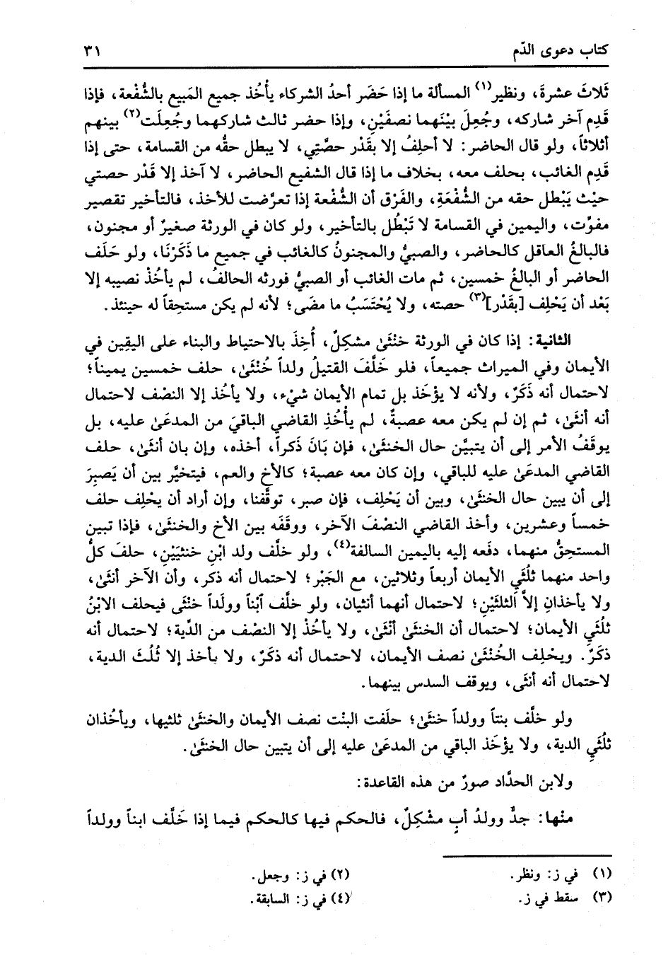 الثانية: إذا كان في الورثة خنْثَى مشكِلٌ، أُخِذَ بالاحتياط والبناء على اليقِين في الأيمان وفي الميراث جميعًا، فلو خلَّفَ القتيلُ ولداً خُنْثَى، حلف خمسين يمينًا؛ لاحتمال أنه ذَكَرٌ، ولأنه لا يؤْخَذ بل تمام الأيمان شيْء، ولا يأخُذ إلا النصْف لاحتمال أنه أنثَى، ثم إن لم يكن معه عصبةٌ، لم يأْخُذِ القاضي الباقيَ من المدعَى عليه، بل يوقَفُ الأمر إلى أن يتبين حال الخنثَى، فإن بَانَ ذَكراً، أخذه، وإن بان أنثَى، حلف القاضي المدعَى عليه للباقي، وإن كان معه عصبة؛ كالأخ والعم، فيتخيَّر بين أن يَصبِرَ إلى أن يبين حال الخنثَى، وبين أن يَحْلِف، فإن صبر، توقَّفنا، وإن أراد أن يحْلِف حلف خمسًا وعشرين، وأخذ القاضي النصْفَ الآخر، ووقَفَه بين الأخ والخنثَى، فإذا تبين المستحِقُّ منهما، دفَعه إليه باليمين السالفة (¬4)، ولو خلَّف ولد ابْنِ خنثيَيْنِ، حلفَ كلُّ واحد منهما ثلُثَي الأيمان أربعًا وثلاثين، مع الجَبْر؛ لاحتمال أنه ذكر، وأن الآخر أنثَى، ولا يأخذانِ إلاَّ الثلثَيْنِ؛ لاحتمال أنهما أنثيان، ولو خلَّف ابْنًا وولَداً خنْثَى فيحلف الابْنُ ثلُثَي الأيمان؛ لاحتمال أن الخنثَى أنْثَى، ولا يأخُذْ إلا النصْف من الدِّية؛ لاحتمال أنه ذكَرٌ. ويحْلِف الخُنْثَى نصف الأيمان، لاحتمال أنه ذكَرٌ، ولا يأخذ إلا ثُلُثَ الدية، لاحتمال أنه أنثَى، ويوقف السدس بينهما.
