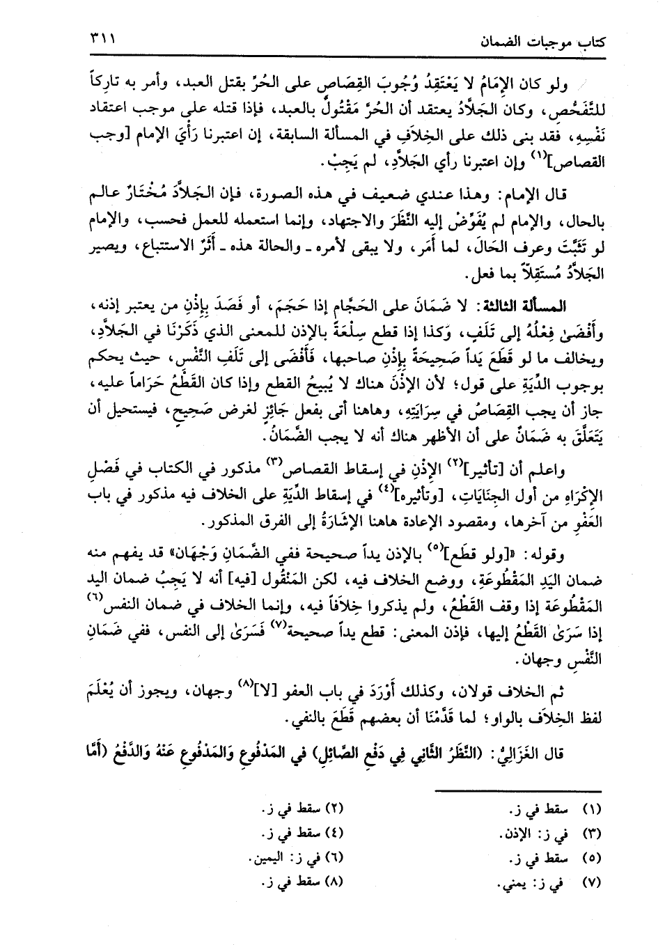 قال الإِمام: وهذا عندي ضعيف في هذه الصورة، فإن الجَلاَّدَ مُخْتَارٌ عالم بالحال، والإمام لم يُفَوِّضْ إليه النَّظَرَ والاجتهاد، وإنما استعمله للعمل فحسب، والإمام لو تَثَبَّتَ وعرف الحَالَ، لما أَمَر، ولا يبقى لأمره -والحالة هذه- أَثَرٌ الاستتباع، وبصير الجَلاَّدُ مُستَقِلاً بما فعل.