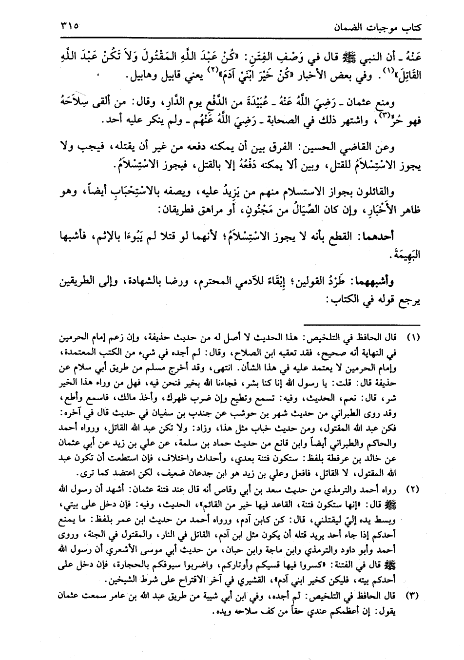 (¬2) رواه أحمد والترمذي من حديث سعد بن أبي وقاص أنه قال عند فتنة عثمان؛ أشهد أن رسول الله -صلى الله عليه وسلم- قال: "إنها ستكون فتنة، القاعد فيها خير من القائم"، الحديث، وفيه: فإن دخل على بيتي، وبسط يده إليّ ليقتلني، قال: كن كابن آدم، ورواه أحمد من حديث ابن عمر بلفظ: ما يمنع أحدكم إذا جاء أحد يريد قتله أن يكون مثل ابن آدم، القاتل في النار، والمقتول في الجنة، وروى أحمد وأبو داود والترمذي وابن ماجة وابن حبان، من حديث أبي موسى الأشعري أن رسول الله -صلى الله عليه وسلم- قال في الفتنة: "كسروا فيها قسيكم وأوتاركم، واضربوا سيوفكم بالحجارة، فإن دخل على أحدكم بيته، فليكن كخير ابني آدم"، القشيري في آخر الاقتراح على شرط الشيخين.
