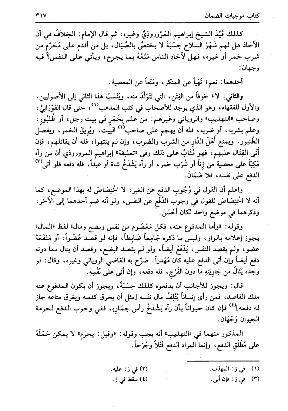 والثاني: لا؛ خوفاً من الفِتَنِ، التي تَتَوَلَّدُ منه، ويُنْسَبُ هذا الثاني إلى الأصوليين، والأول للفقهاء، وهو الذي يوجد للأصحاب في كتب المذهب (¬1)، حتى قال الفَوْرَانِيُّ، وصاحب "التهذيب" والروياني وغيرهم: من علم بِخَمْرٍ في بيت رجل، أو طُنْبُورٍ، وعلم بشربه، أو ضربه، فله أن يهجم على صاحب (¬2) البيت، ويُرِيقَ الخمر، ويفصل الطّنبور، ويمنع أَهْلَ الدَّارِ من الشرب والضرب، وإن لم ينتهوا، فله أن يقاتلهم، فإن أَتَى القِتَال عليهم، فهو مُثَابٌ على ذلك وفي "تعليقة" إبراهيم المروروذي أن من رآه مُكِبّاً على معصية من زِناً أو شُرْب خمر، أو رآه يَشْدَخُ شاة أو عبداً، فله دفعه فلو أتى (¬3) الدفع على نفسه، فلا ضَمَانَ.