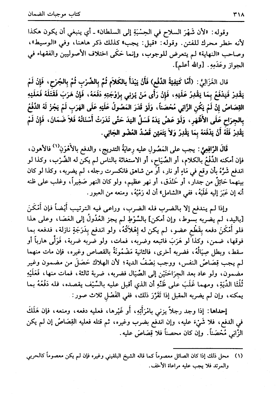 قال الغَزَالِيُّ: (أَمَّا كَيْفِيَّةُ الدَّفْع) فَأَنْ يَبْدَأَ بالكَلاَم ثُمَّ بِالضَّرْبِ ثُمَّ بِالجُرْحِ، فَإِنْ لَمْ يَقْدِرْ فَيَدْفَعُ بِمَا يَقْدِرُ عَلَيْهِ، فَإِنْ رَأَى مَنْ يُزنِي بِزَوْجَتِهِ دَفَعَهُ، فَإِنْ هَرَبَ فَقَتَلَهُ فَعَلَيْهِ القِصَاصُ إنْ لَمْ يَكُنِ الزَّانِي مُحْصَناً، وَلَوْ قَدَرَ المَصُولُ عَلَيْهِ عَلَى الهَرَبِ لَمْ يَجُزْ لَه الدَّفْعُ بِالجِرَاحِ عَلَى الأَظْهَرِ، وَلَوْ عَضَّ يَدَهُ فَسَلَّ اليَدَ حَتَّى نَدَرَتْ أَسْنَانُهُ فَلاَ ضَمَانَ، فَإنْ لَمْ يَقْدِرْ فَلَهُ أن يَدْفَعَهُ بِمَا يَقْدِرُ وَلاَ يَتَعَيَّن قَصْدُ العُضْو الجَانِي.