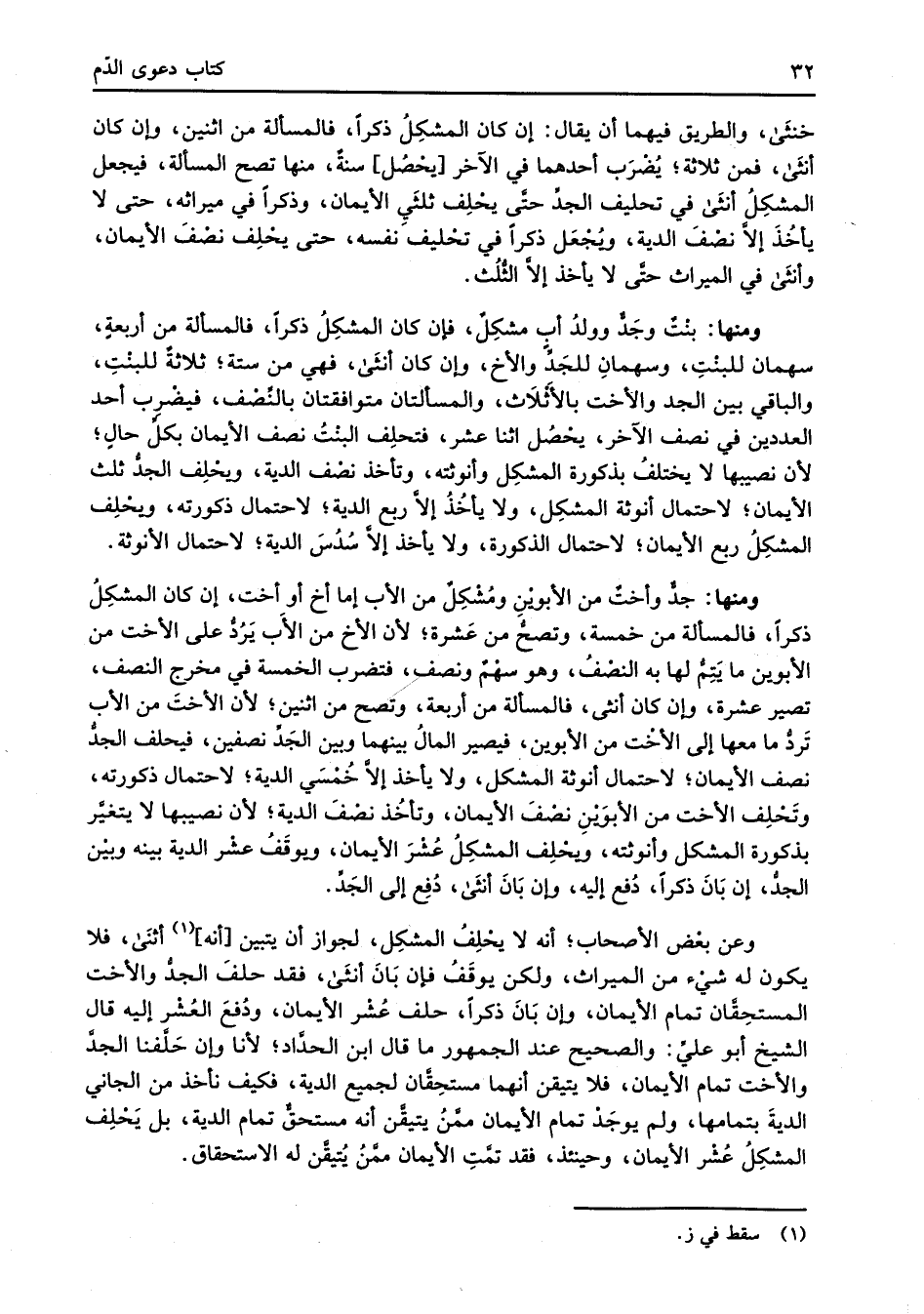 خنثَى، والطريق فيهما أن يقال: إن كان المشكِلُ ذكرًا، فالمسألة من اثنين، وإن كان أنثَى، فمن ثلاثة؛ يُضْرَب أحدهما في الآخر [يحْصُل] سنةٌ، منها تصح المسألة، فيجعل المشكِلُ أنثَى في تحليف الجدِّ حتَّى يحْلِف ثلثَي الأيمان، وذكراً في ميراثه، حتى لا يأخُذَ إلاَّ نصْفَ الدية، ويُجْعَل ذكرًا في تحْليف نفسه، حتى يحْلِف نصْفَ الأيمان، وأنثَى في الميراث حتَّى لا يأخذ إلاَّ الثُّلُث.