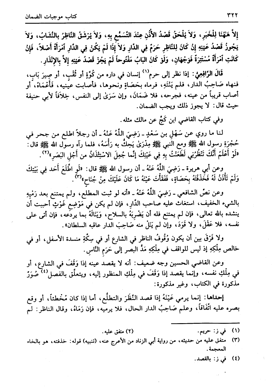 قَالَ الرَّافِعِيُّ: إذا نظر إلى حرم (¬1) إنسان في داره من كُوَّةٍ أو ثُقْبِ، أو صِيرَ بَابٍ، فنهاه صَاحِبُ الدار، فلم يَنْتَهِ، فرماه بحَصَاةِ ونحوها، فأصابت عينيه، فَأعْمَاهُ، أو أصاب قريباً من عينه، فجرحه، فلا ضَمَانَ، وإن سَرَى إلى النفس، خِلاَفاً لأبي حنيفة حيث قال: لا يجوز ذلك ويجب الضمان.