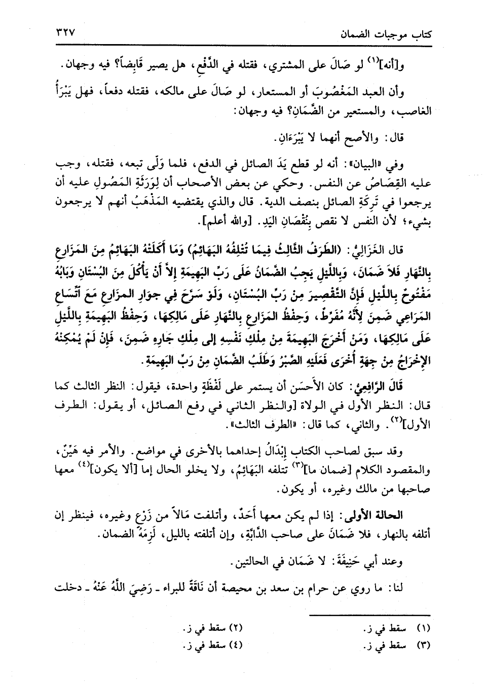 قال الغَزَالِيُّ: (الطَرَفُ الثَّالِثُ فِيمَا تُتْلِفُهُ البَهَائِمُ) وَمَا أكَلَتْهُ البَهَائِمُ مِنَ المَزَارعِ بِالنَّهَارِ فَلا ضَمَانَ، وَبِاللَّيْلِ يَجِبُ الضَّمَانُ عَلَى رَبِّ البَهِيمَةِ إِلاَّ أَنْ يَأْكُلَ مِنَ البُسْتَانِ وَبَابُهُ مَفْتُوحٌ بِاللَّيْلِ فَإنَّ التَّقْصِيرَ مِنْ رَبِّ البُسْتَانِ، وَلَوْ سَرَّحَ فِي جوَارِ المزَارعِ مَعَ اتِّسَاعِ المَرَاعِي ضَمِنَ لِأَنَّهُ مفَرِّطٌ، وَحِفْظُ المَزَارعِ بِالنَّهَارِ عَلَى مَالِكِهَا، وَحِفْظُ البَهِيمَةِ بِاللَّيْلِ عَلَى مَالِكِهَا، وَمَنْ أَخْرَجَ البَهِيمَةَ مِنْ مِلْكِ نَفْسِهِ إلى مِلْكِ جَارِهِ ضَمِنَ، فَإِنْ لَمْ يُمْكِنْهُ الإِخْراجُ مِنْ جِهَةٍ أُخْرَى فَعَلَيْهِ الصَّبْرُ وَطَلَبُ الضَّمَانِ مِنْ رَبِّ البَهِيمَةِ.