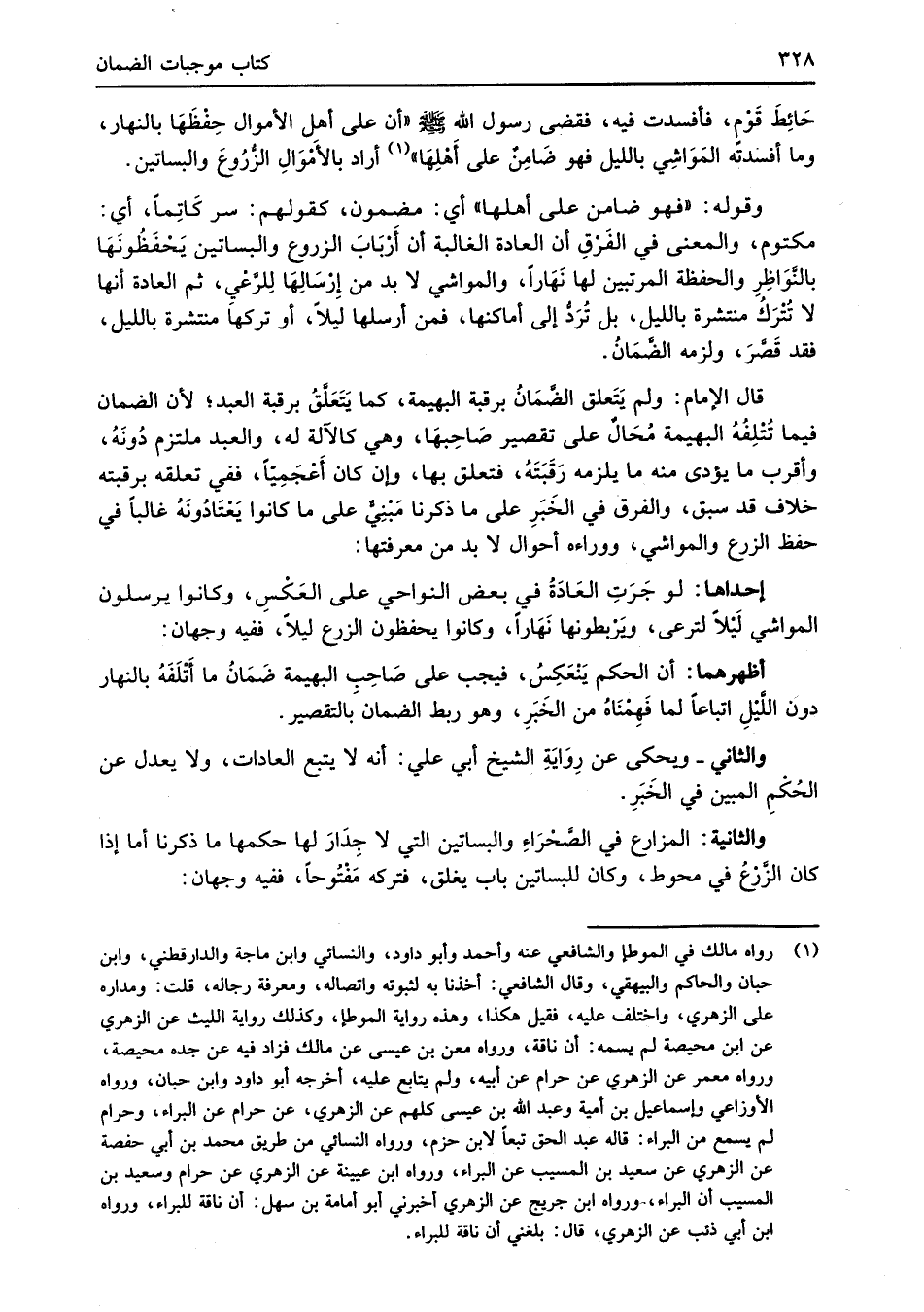 (¬1) رواه مالك في الموطإ والشافعي عنه وأحمد وأبو داود، والنسائي وابن ماجة والدارقطني، وابن حبان والحاكم والبيهقي، وقال الشافعي: أخذنا به لثبوته واتصاله، ومعرفة رجاله، قلت: ومداره على الزهري، واختلف عليه، فقيل هكذا، وهذه رواية الموطإ، وكذلك رواية الليث عن الزهري عن ابن محيصة لم يسمه: أن ناقة، ورواه معن بن عيسى عن مالك فزاد فيه عن جده محيصة، ورواه معمر عن الزهري عن حرام عن أبيه، ولم يتابع عليه، أخرجه أبو داود وابن حبّان، ورواه الأوزاعي وإسماعيل بن أمية وعبد الله بن عيسى كلهم عن الزهري، عن حرام عن البراء، وحرام لم يسمع من البراء: قاله عبد الحق تبعًا لابن حزم، ورواه النسائي من طريق محمد بن أبي حفصة عن الزهري عن سعيد بن المسيب عن البراء، ورواه ابن عيينة عن الزهري عن حرام وسعيد بن المسيّب أن البراء، ورواه ابن جريج عن الزهري أخبرني أبو أمامة بن سهل: أن ناقة للبراء، ورواه ابن أبي ذئب عن الزهري، قال: بلغني أن ناقة للبراء.