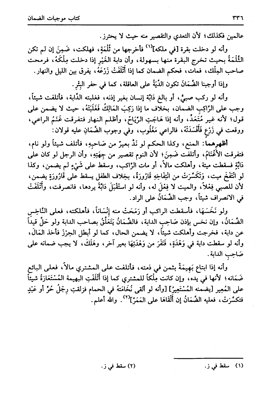 وأنه إذا ابتاع بَهِيمَةً بثمن في ذمته، فأتلفت على المشتري مالاً، فعلى البائع ضَمَانه؛ لأنها في يده، وإن كانت مِلْكاً للمشتري كما إذا أَتْلَفَتِ البهيمة المُسْتَعَارَةُ شيئًا على المُعِير [يضمنه المُسْتَعِيرُ] [وأنه لو ألقى نُخَامَتهُ في الحمام فزلقتِ رِجْلُ حُرٍّ أو عَبْدٍ فتكسَّرَتْ، فعليه الضَّمَانُ إن ألْقَاهَا على المَمَرِّ] (¬2). والله أعلم.
