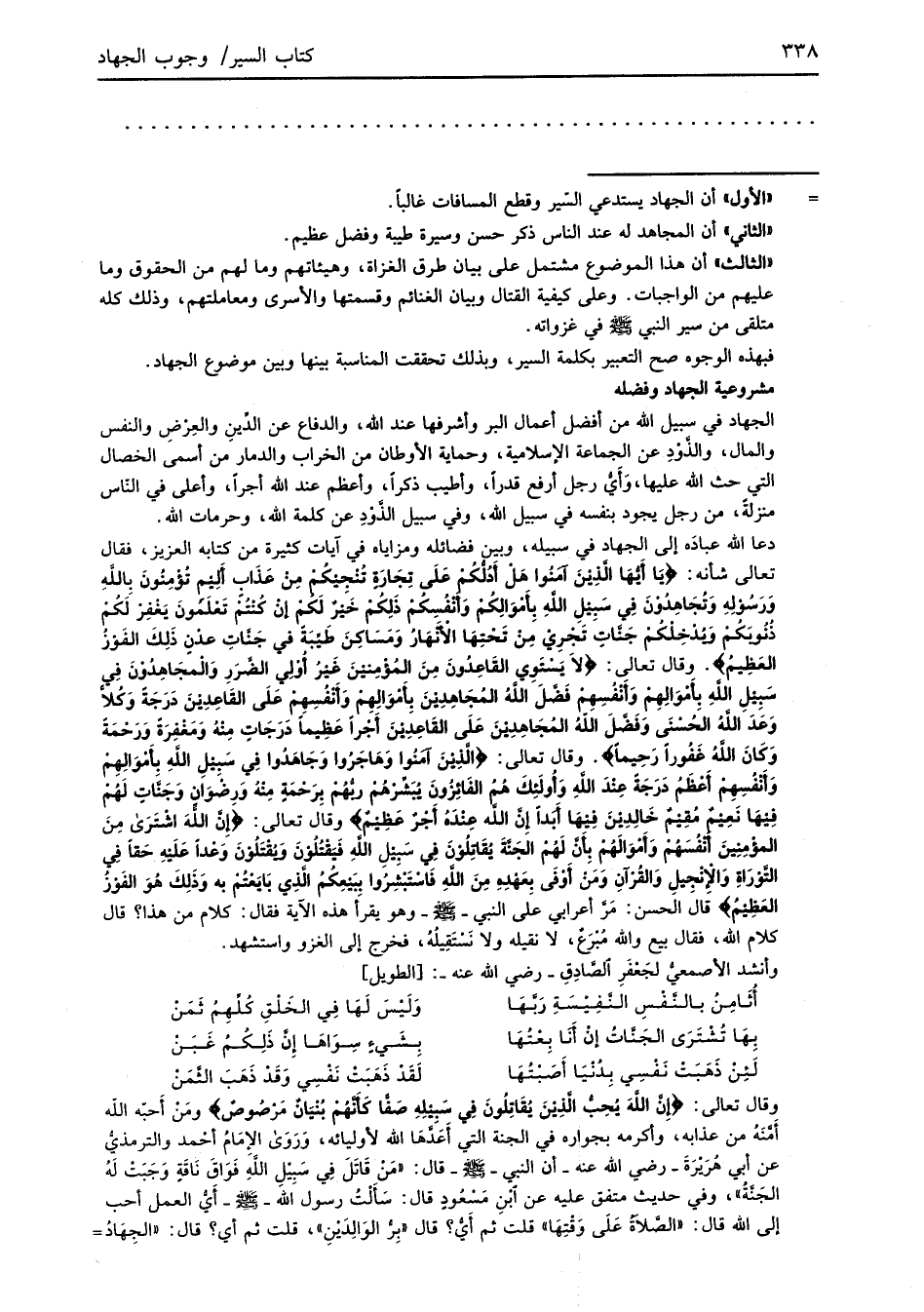دعا الله عبادَه إلى الجهاد في سبيله، وبين فضائله ومزاياه في آيات كثيرة من كتابه العزيز، فقال تعالى شأنه: {يَا أَيُّهَا الَّذِينَ آمَنُوا هَلْ أَدُلُّكُمْ عَلَى تِجَارَةٍ تُنْجِيكُمْ مِنْ عَذَابٍ أَلِيمٍ {تُؤْمِنُونَ بِاللَّهِ وَرَسُولِهِ وَتُجَاهِدُونَ فِي سَبِيلِ اللَّهِ بِأَمْوَالِكُمْ وَأَنْفُسِكُمْ ذَلِكُمْ خَيْرٌ لَكُمْ إِنْ كُنْتُمْ تَعْلَمُونَ يَغْفِرْ لَكُمْ ذُنُوبَكُمْ وَيُدْخِلْكُمْ جَنَّاتٍ تَجْرِي مِنْ تَحْتِهَا الْأَنْهَارُ وَمَسَاكِنَ طَيِّبَةً فِي جَنَّاتِ عَدْنٍ ذَلِكَ الْفَوْزُ الْعَظِيمُ} وقال تعالى: {لَا يَسْتَوِي الْقَاعِدُونَ مِنَ الْمُؤْمِنِينَ غَيْرُ أُولِي الضَّرَرِ وَالْمُجَاهِدُونَ فِي سَبِيلِ اللَّهِ بِأَمْوَالِهِمْ وَأَنْفُسِهِمْ فَضَّلَ اللَّهُ الْمُجَاهِدِينَ بِأَمْوَالِهِمْ وَأَنْفُسِهِمْ عَلَى الْقَاعِدِينَ دَرَجَةً وَكُلًّا وَعَدَ اللَّهُ الْحُسْنَى وَفَضَّلَ اللَّهُ الْمُجَاهِدِينَ عَلَى الْقَاعِدِينَ أَجْرًا عَظِيمًا دَرَجَاتٍ مِنْهُ وَمَغْفِرَةً وَرَحْمَةً وَكَانَ اللَّهُ غَفُورًا رَحِيمًا}. وقال تعالى: {الَّذِينَ آمَنُوا وَهَاجَرُوا وَجَاهَدُوا فِي سَبِيلِ اللَّهِ بِأَمْوَالِهِمْ وَأَنْفُسِهِمْ أَعْظَمُ دَرَجَةً عِنْدَ اللَّهِ وَأُولَئِكَ هُمُ الْفَائِزُونَ يُبَشِّرُهُمْ رَبُّهُمْ بِرَحْمَةٍ مِنْهُ وَرِضْوَانٍ وَجَنَّاتٍ لَهُمْ فِيهَا نَعِيمٌ مُقِيمٌ خَالِدِينَ فِيهَا أَبَدًا إِنَّ اللَّهَ عِنْدَهُ أَجْرٌ عَظِيمٌ} وقال تعالى: {إِنَّ اللَّهَ اشْتَرَى مِنَ الْمُؤْمِنِينَ أَنْفُسَهُمْ وَأَمْوَالَهُمْ بِأَنَّ لَهُمُ الْجَنَّةَ يُقَاتِلُونَ فِي سَبِيلِ اللَّهِ فَيَقْتُلُونَ وَيُقْتَلُونَ وَعْدًا عَلَيْهِ حَقًّا فِي التَّوْرَاةِ وَالْإِنْجِيلِ وَالْقُرْآنِ وَمَنْ أَوْفَى بِعَهْدِهِ مِنَ اللَّهِ فَاسْتَبْشِرُوا بِبَيْعِكُمُ الَّذِي بَايَعْتُمْ بِهِ وَذَلِكَ هُوَ الْفَوْزُ الْعَظِيمُ} قَالَ الحسن: مَرَّ أعرابي على النبي -صلى الله عليه وسلم- وهو يقرَأ هذه الآية فقال: كلام من هذا؟ قال كلام الله، فقال بيع والله مُبْرَعٌ، لا نقيله ولا نَسْتَقِيلُهُ، فخرج إلى الغزو واستثهد.