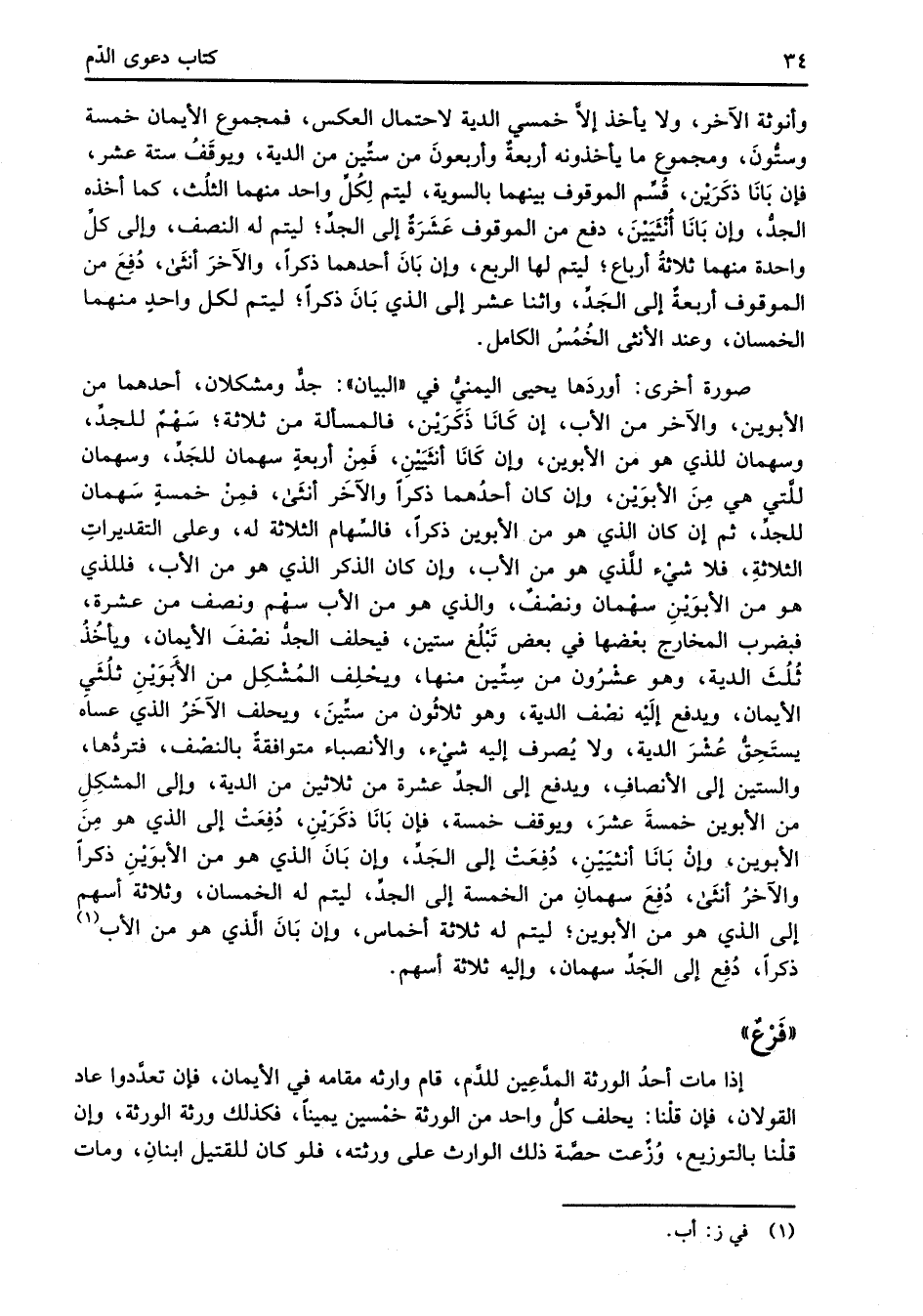 وأنوثة الآخر، ولا يأخذ إلاَّ خمس الدية لاحتمال العكس، فمجموع الأيمان خمسة وستُّونَ، ومجموع ما يأخذونه أربعةٌ وأربعونَ من ستِّين من الدية، ويوقَفُ ستة عشر، فإن بانا ذكَرَيْن، قُسِّم الموقوف بينهما بالسوية، ليتم لِكُلِّ واحد منهما الثلُث، كما أخذه الجدُّ، وإن بَانَا أُنْثَيَيْنَ، دفع من الموقوف عَشَرَةٌ إلى الجد؛ ليتم له النصف، وإلى كلِّ واحدة منهما ثلاثةُ أرباع؛ ليتم لها الربع، وإن بَانَ أحدهما ذكرًا، والآخرَ أنثَى، دُفِعَ من الموقوف أربعةٌ إلى الجَدِّ، واثنا عشر إلى الذي بَانَ ذكرًا؛ ليتم لكل واحدٍ منهما الخمسان، وعند الأنثى الخُمُسُ الكامل.