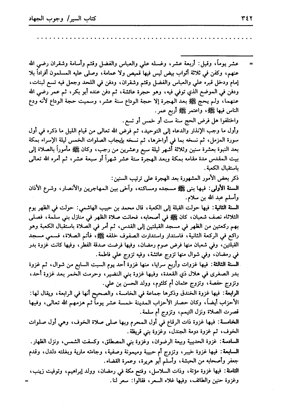 = عشر يومًا، وقيل: أربعة عشر، وغسله علي والعباس والفضل وقثم وأسامة وشقران رضي الله عنهم، وكفن في ثلاثة أثواب بيض ليس فيها قميص ولا عمامة، وصلى عليه المسلمون أفراداً بلا إمام ودخل قبره علي والعباس والفضل وقثم وشقران، ودفن في اللحد وجعل فيه تسع لبنات، ودفن في الموضع الذي توفي فيه، وهو حجرة عائشة، ثم دفن عنده أبو بكر، ثم عمر رضي الله عنهما، ولم يحج -صلى الله عليه وسلم- بعد الهجرة إلا حجة الوداع سنة عشر، وسميت حجة الوداع لأنه ودع الناس فيها -صلى الله عليه وسلم-، واعتمر -صلى الله عليه وسلم- أربع عمر.