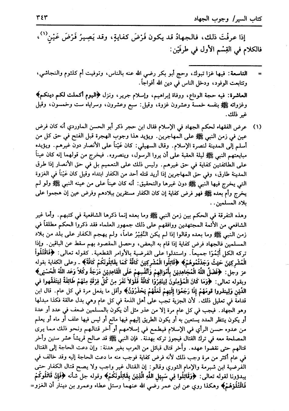 وهذه التفرقة في الحكم بين زمن النبي -صلى الله عليه وسلم- وما بعده إنما ذكرها الشافعية في كتبهم. وأما غير الشافعي من الأئمة المجتهدين ووافقهم على ذلك جمهور العلماء فقد ذكروا الحكم مطلقًا في زمن النبي -صلى الله عليه وسلم- وما بعده وقالوا إذا لم يكن النَّفِيْرُ عامًا، ولم يهجم الكفار على بلد من بلاد المسلمين فالجهاد فرض كفاية إذا قام به البعض، وحصل المقصود بهم سقط عن الباقين. وإذا تركه الكل أَثِمُوْا جميعًا. واستدلوا على الفرضية بالأوامر القطعية. كقوله تعالى: {فَاقْتُلُوا الْمُشْرِكِينَ حَيْثُ وَجَدْتُمُوهُمْ} {قَاتِلُوا الْمُشْرِكِينَ كَافَّةً كَمَا يُقَاتِلُونَكُمْ كَافَّةً} -وعلى الكفاية بقوله عَزَّ وَجَلَّ: {فَضَّلَ اللَّهُ الْمُجَاهِدِينَ بِأَمْوَالِهِمْ وَأَنْفُسِهِمْ عَلَى الْقَاعِدِينَ دَرَجَةً وَكُلًّا وَعَدَ اللَّهُ الْحُسْنَى} وبقوله تعالى: {وَمَا كَانَ الْمُؤْمِنُونَ لِيَنْفِرُوا كَافَّةً فَلَوْلَا نَفَرَ مِنْ كُلِّ فِرْقَةٍ مِنْهُمْ طَائِفَةٌ لِيَتَفَقَّهُوا فِي الدِّينِ وَلِيُنْذِرُوا قَوْمَهُمْ إِذَا رَجَعُوا إِلَيْهِمْ لَعَلَّهُمْ يَحْذَرُونَ} وأقل ما يفعل مرة في كل عام. قال ابن قدامة في تعليل ذلك. لأن الجزية تجب على أهل الذمة في كل عام وهي بدل عالقة فكذا مبدلها وهو الجهاد. فيجب في كل عام مرة إلا من عذر مثل أن يكون بالمسلمين ضعف في عدد أو عدة أو يكون ينتظر المدد يستعين به أو يكون الطريق إليهم فيها مانع أو ليس فيها علف أو ماء أو يعلم من عدوه حسن الرأي في الإِسلام فيطمع في إسلامهم أو أخر قتالهم ونحو ذلك مما يرى المصلحة معه في ترك القتال فيجوز تركه بهدنة. فإن النبي -صلى الله عليه وسلم- قد صالح قريشاً عشر سنين وأخر قتالهم حتى نقضوا عهده. وأَخر قتال قبائل من العرب بغير هدنة: وإن دعت الحاجة إلى القتال في عام أكثر من مرة وجب ذلك لأنه فرض كفاية فوجب منه ما دعت الحاجة إليه وقد خالف في الفرضية ابن شبرمة والإمام الثوري وقالو: إن القتال غير واجب ولا يصح قتال الكفار حتى يبدؤونا لقوله تعالى: {وَقَاتِلُوا فِي سَبِيلِ اللَّهِ الَّذِينَ يُقَاتِلُونَكُمْ} وقوله جل شأنه {فَإِنْ قَاتَلُوكُمْ فَاقْتُلُوهُمْ} وهكذا روي عن ابن عمر رضي الله عنهما وسئل عطاء وعمرو بن دينار أن الغزو =