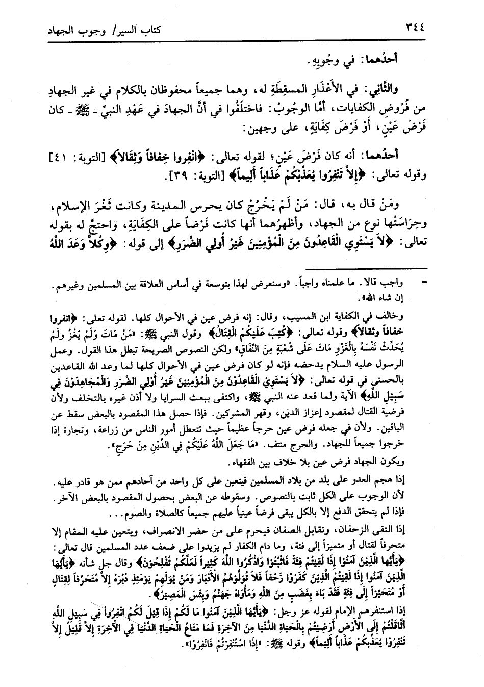 والثَّانِي: في الأَعْذَارِ المسقِطَةِ له، وهما جميعًا محفوظان بالكلام في غير الجهادِ من فُرُوضِ الكفايات، أمَّا الوجُوبُ: فاختلَفُوا في أنَّ الجهادَ في عَهْدِ النبيِّ -صلى الله عليه وسلم- كان فَرْضَ عَيْنٍ، أَوْ فَرْضَ كِفَايَةٍ، على وجهين: